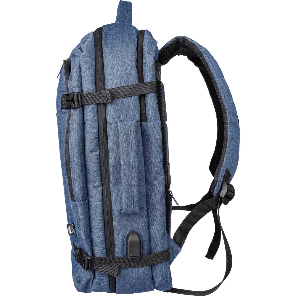 rPET polyester (300D) backpack and laptop bag (17 inch) with 210D lining inside. Cabin-proof. With carrying loop on top and sides. Velcro laptop compartment, anti-theft pocket, and two large zippered compartments. Ventilated padded backing, trolley strap, closing buckles, and USB-A port on the side. With side buckles to keep the luggage compact. Carrying weight approx. 12 kg. Includes rPET label. Printing: Screen-printing