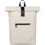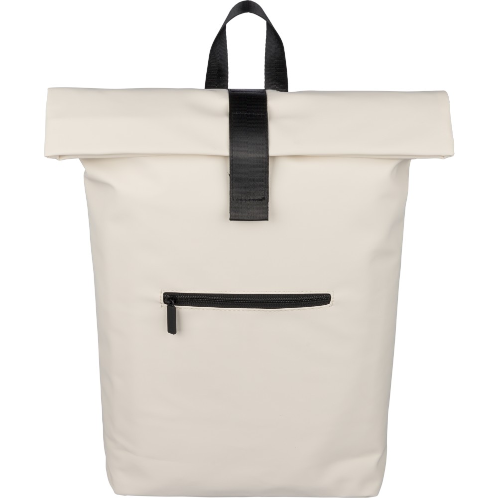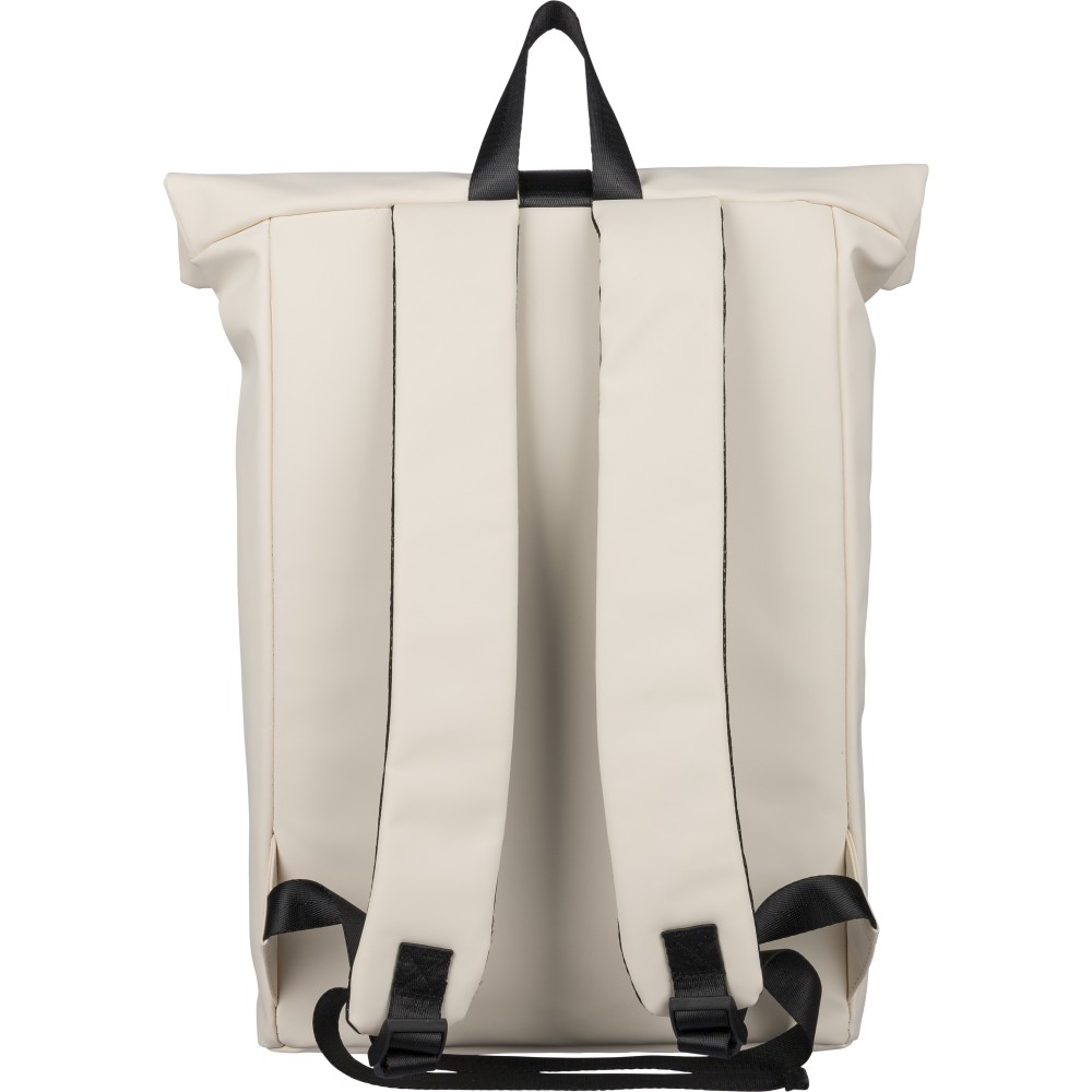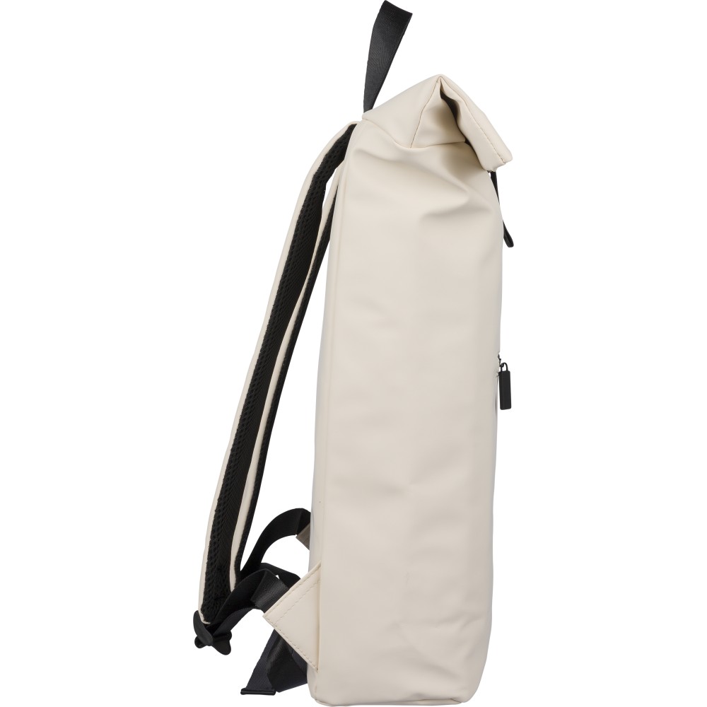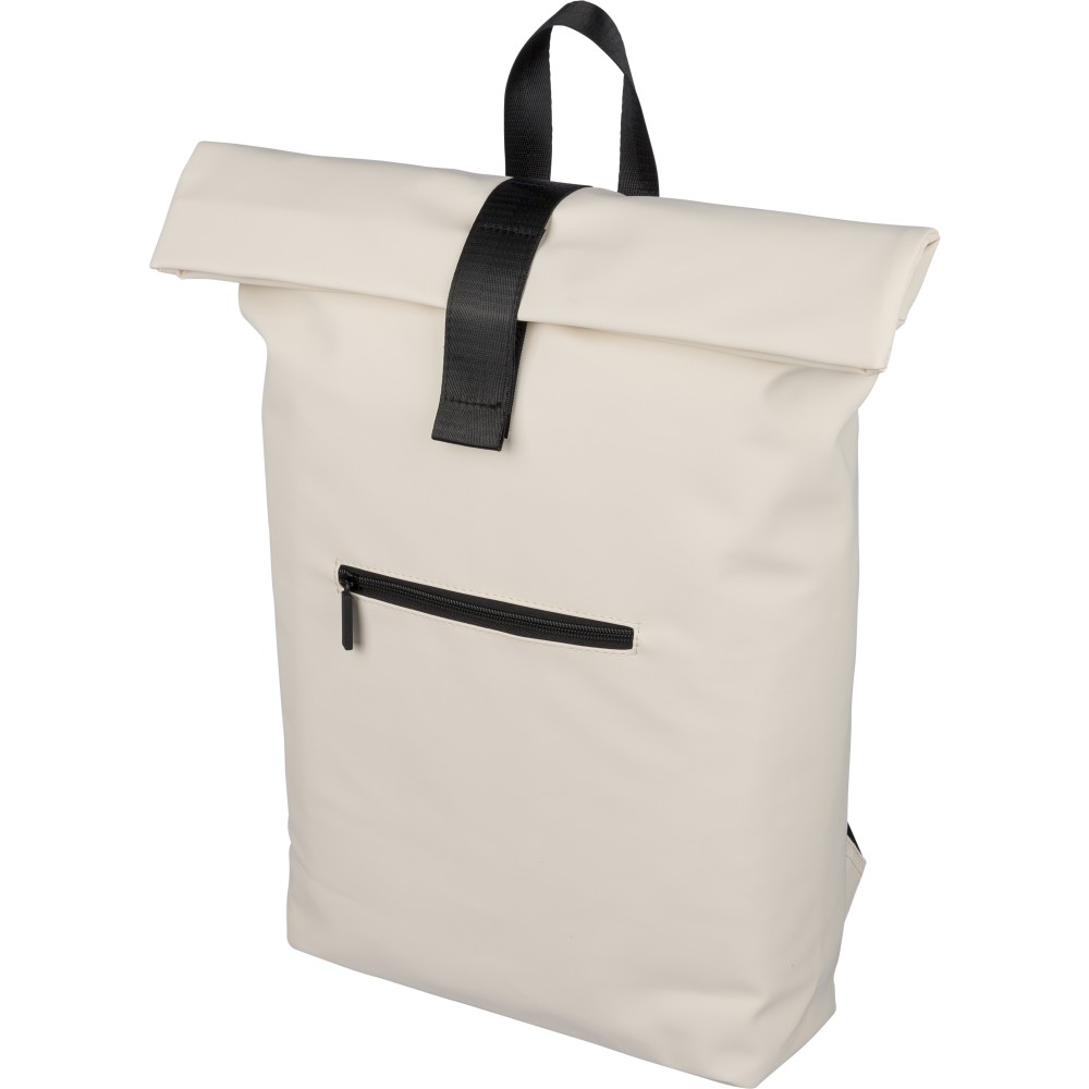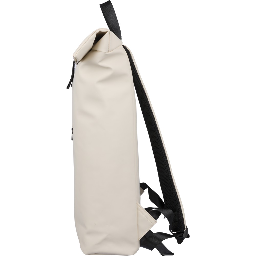 Recycled PU backpack (19 l) with rolltop closure and velcro strip. Features front zip pocket, 16? laptop compartment, 210D recycled lining, adjustable ventilated shoulder straps, top handle, and single recycled label inside.