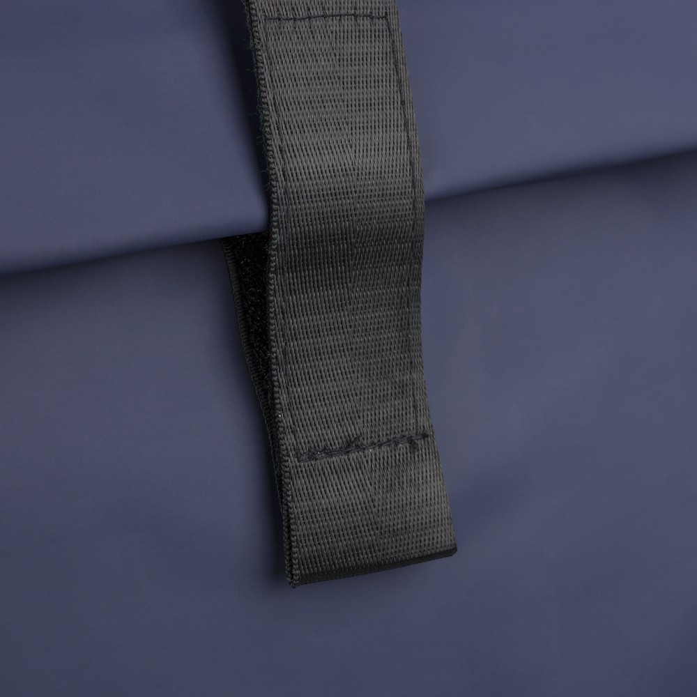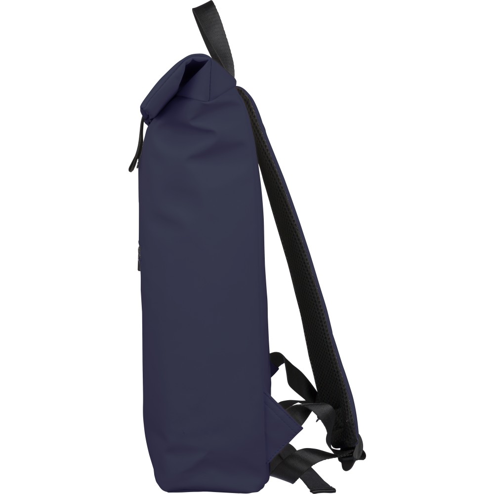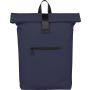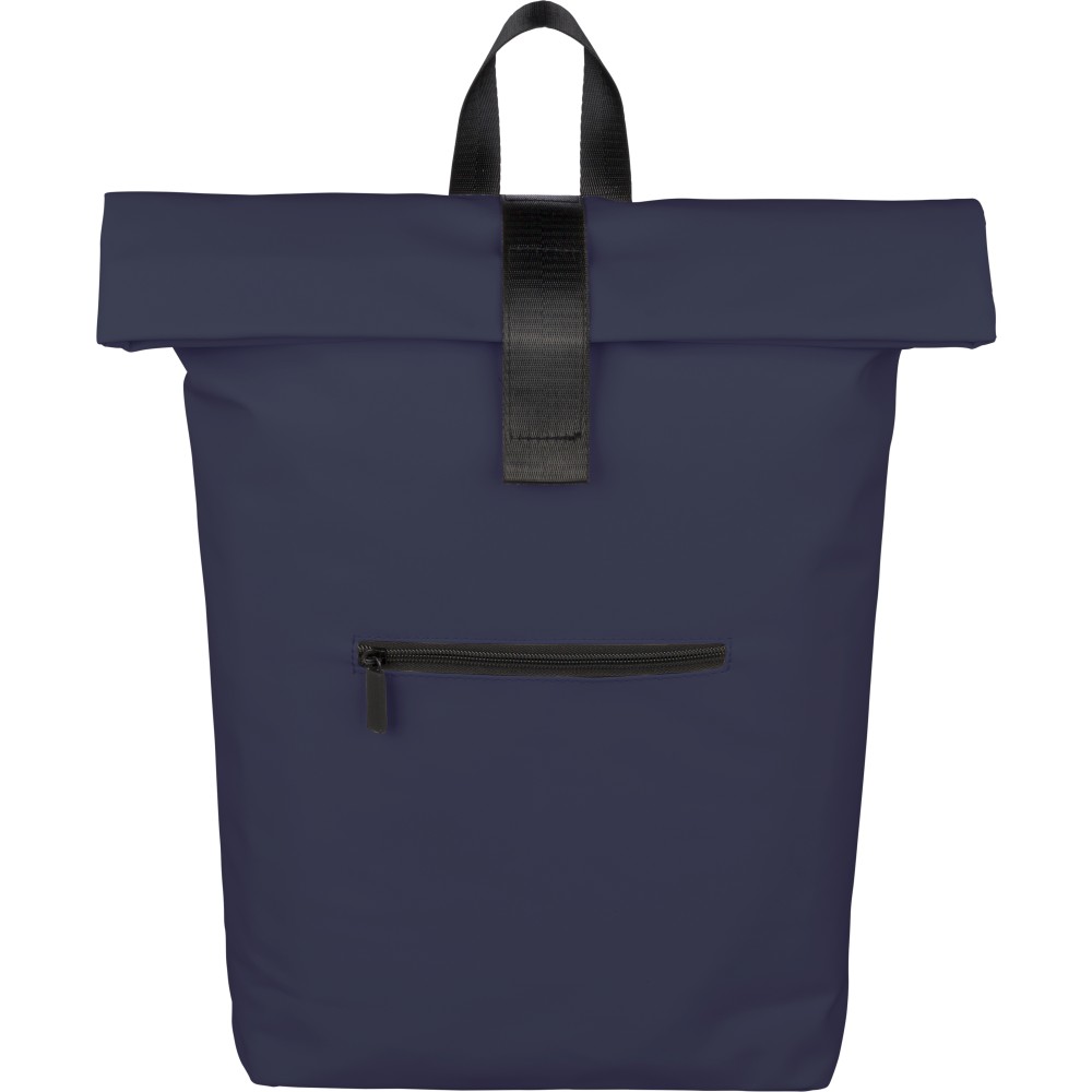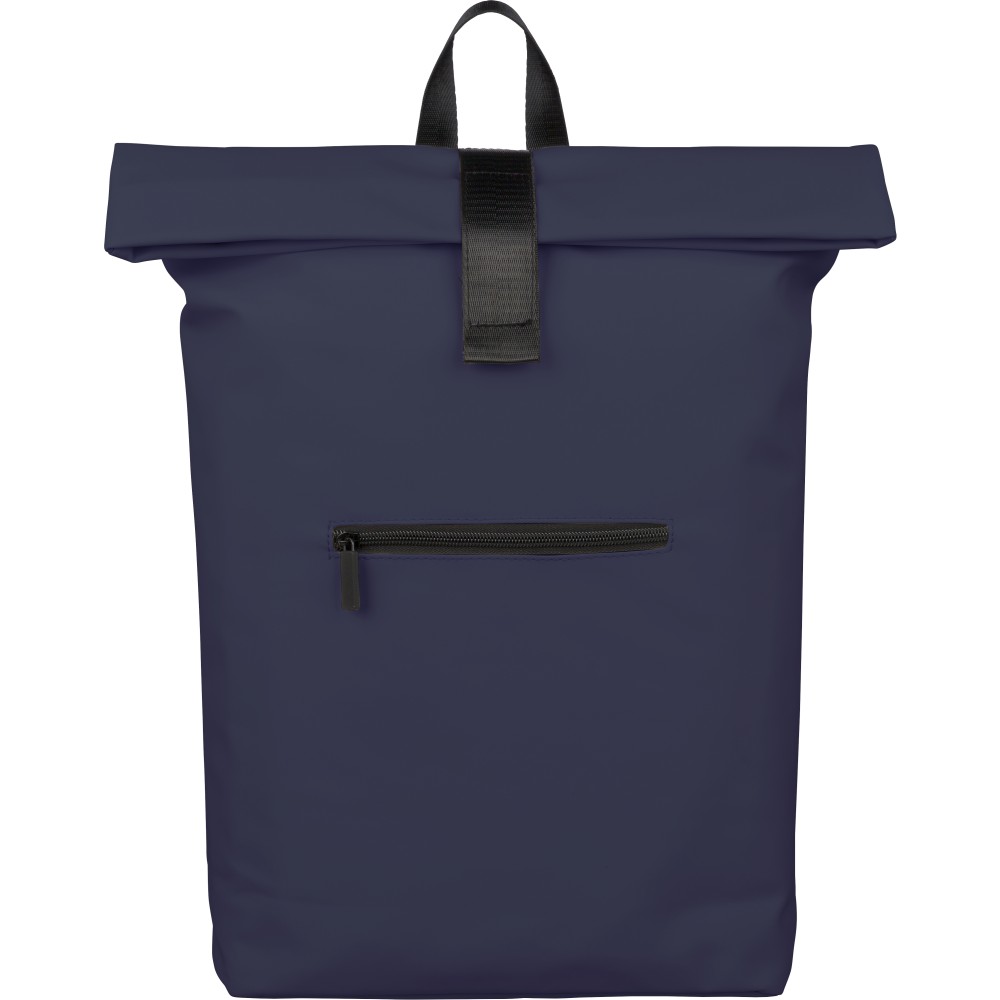 Recycled PU backpack (19 l) with rolltop closure and velcro strip. Features front zip pocket, 16? laptop compartment, 210D recycled lining, adjustable ventilated shoulder straps, top handle, and single recycled label inside.