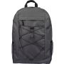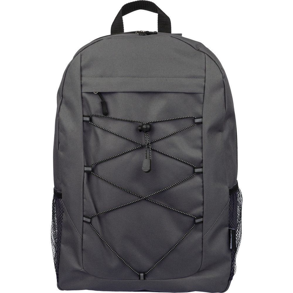 rPET polyester 600D adventure backpack with drawstring closure and large zippered main compartment. Features mesh side pockets, elastic front bands, small front zip pocket for decoration, adjustable straps, and rPET label.