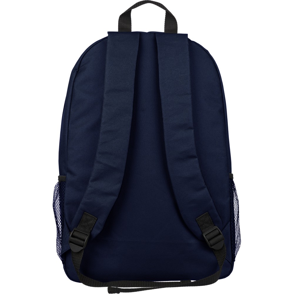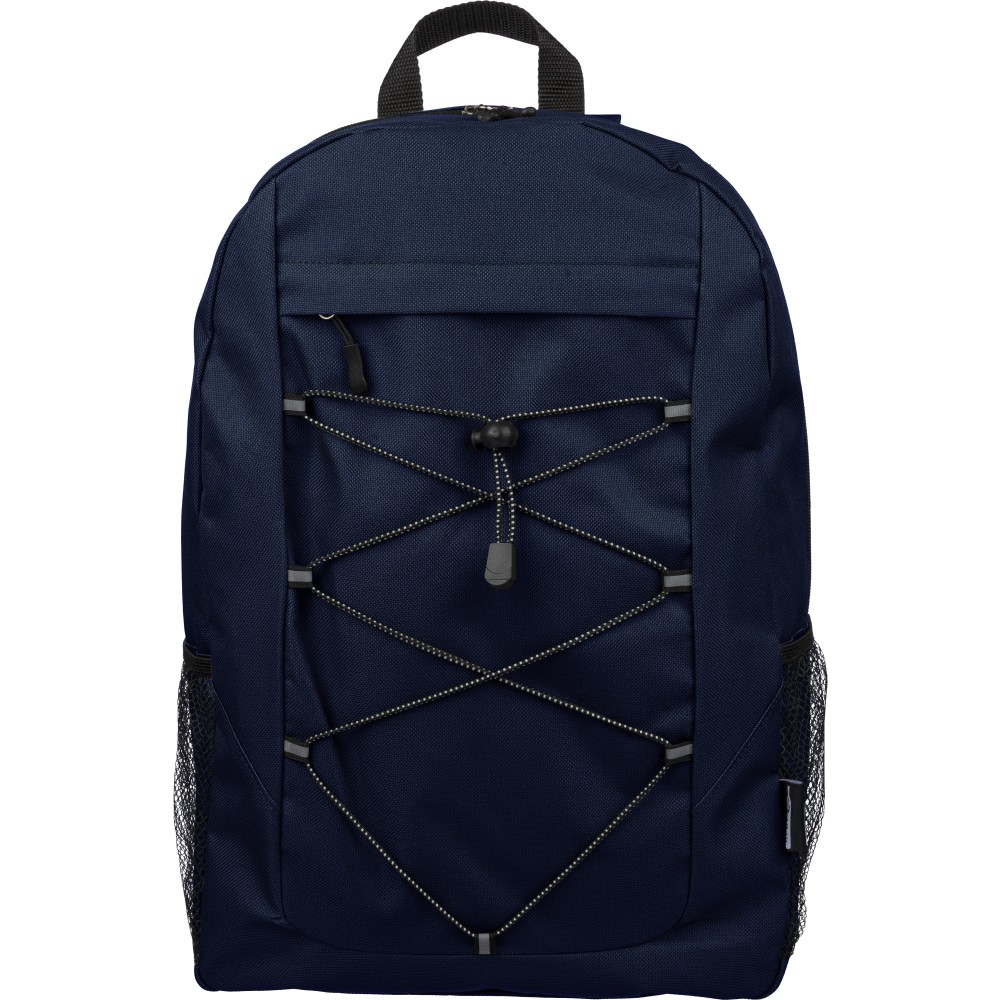 rPET polyester 600D adventure backpack with drawstring closure and large zippered main compartment. Features mesh side pockets, elastic front bands, small front zip pocket for decoration, adjustable straps, and rPET label.