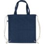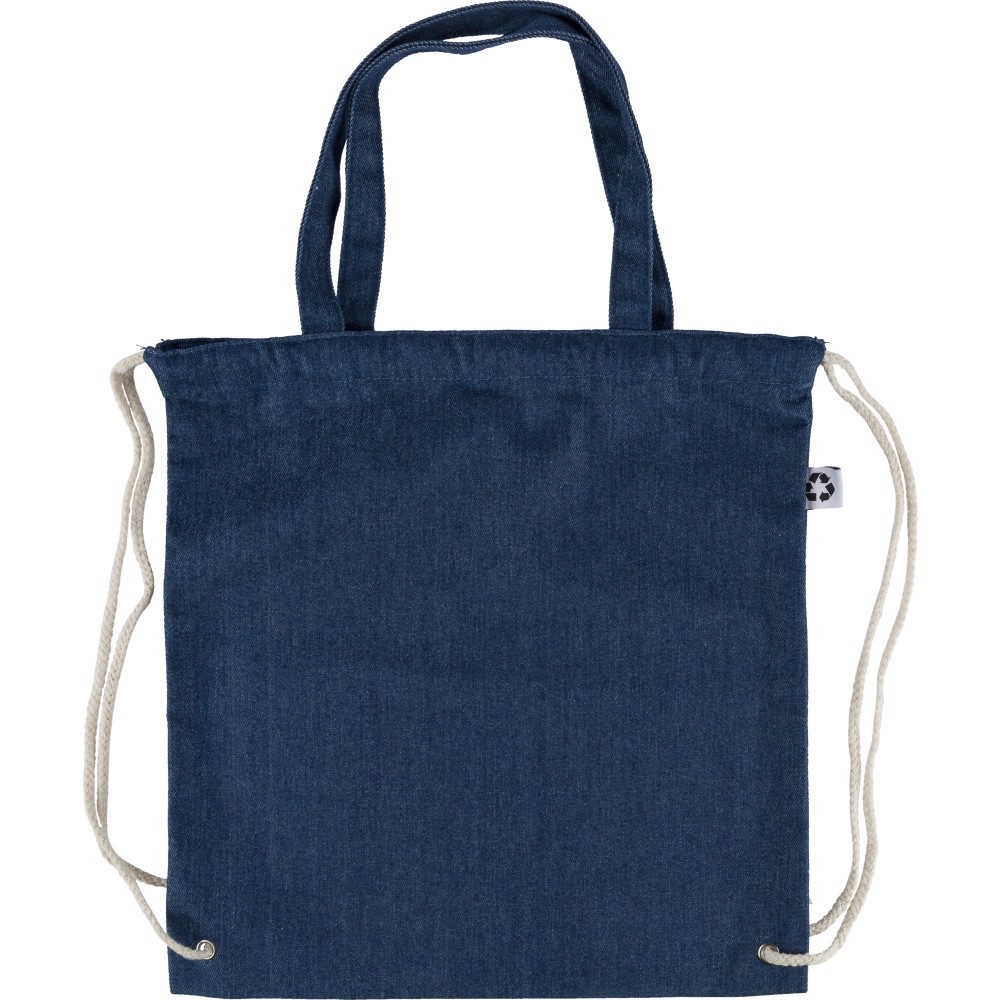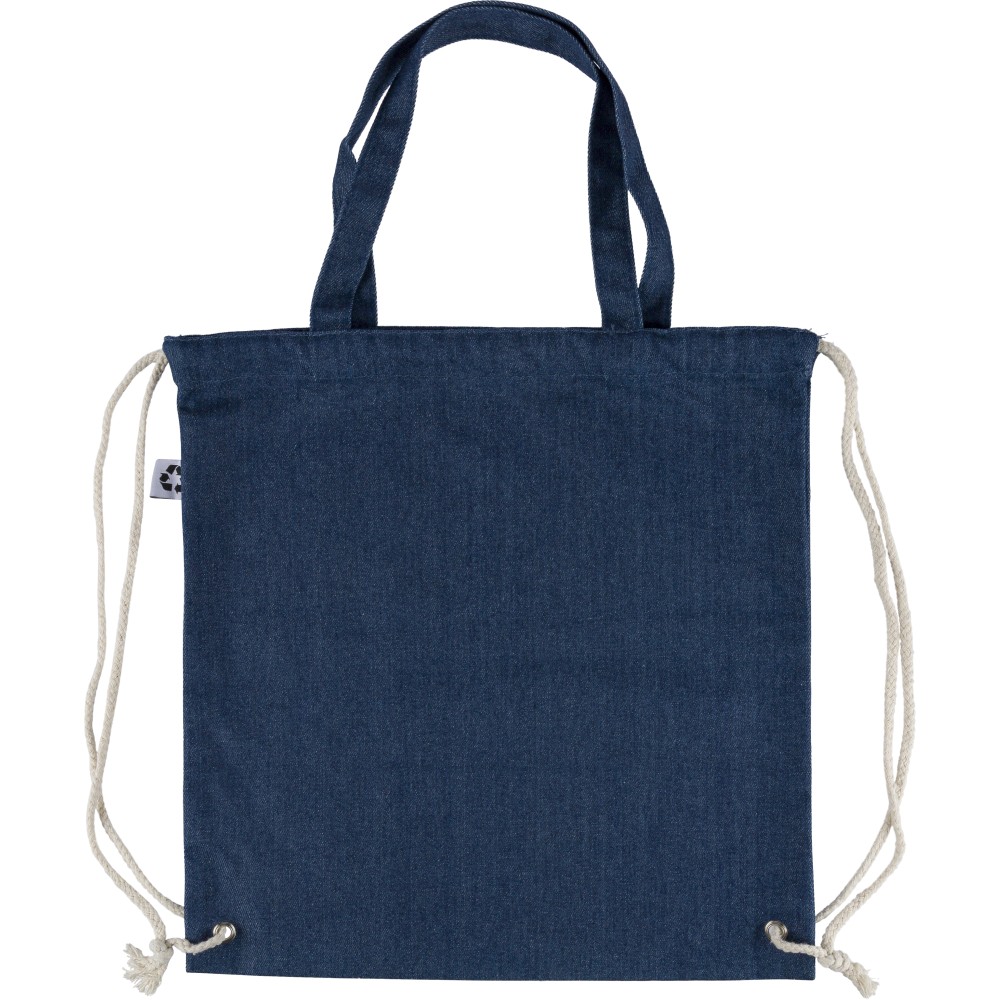 Recycled denim drawstring bag with size 40 x 38 cm. Features long handles of 2.5 x 50 cm and a pull cord for closing. Includes a recycled label on the outside and can be carried by shoulder straps or hand loop. Printing: Screen-printing