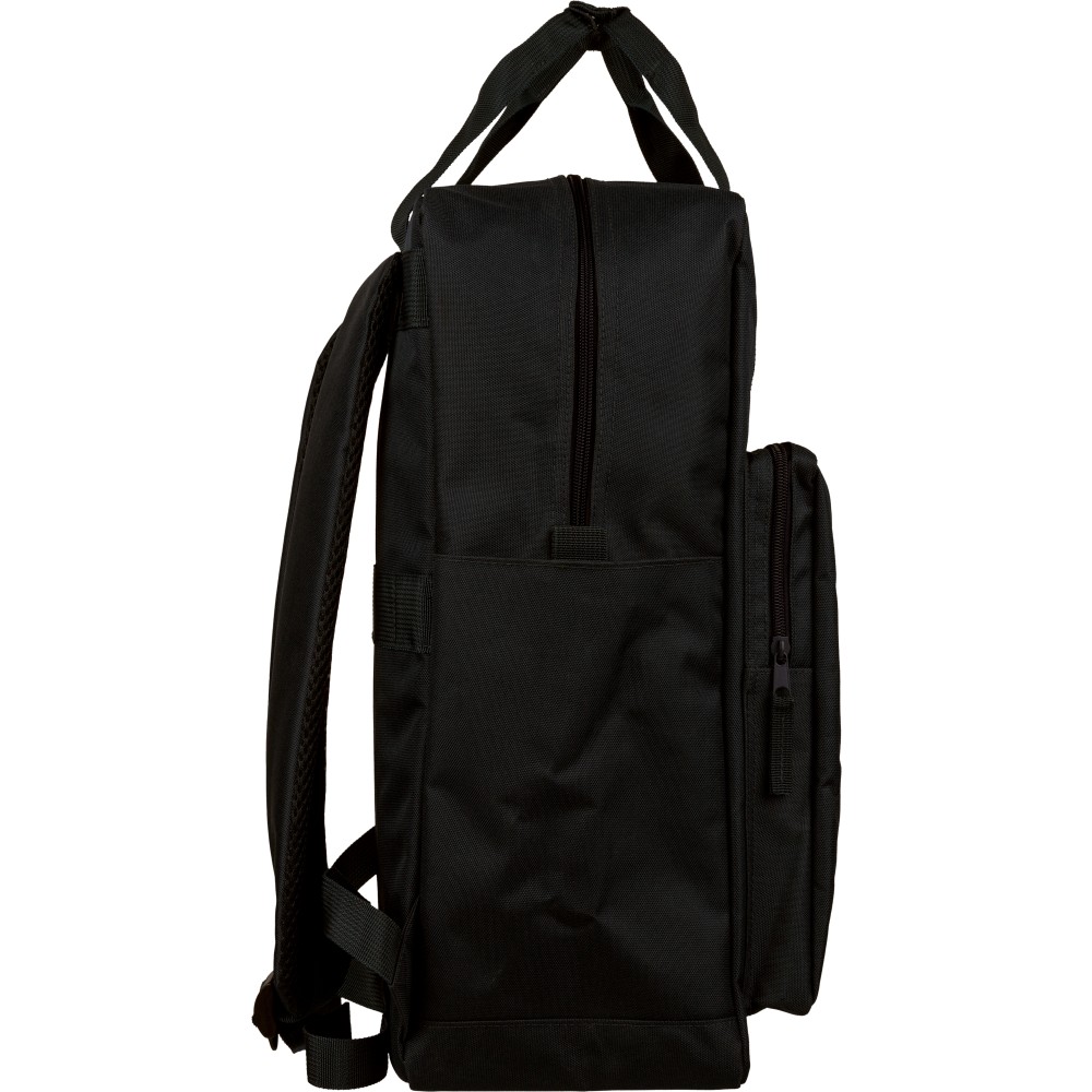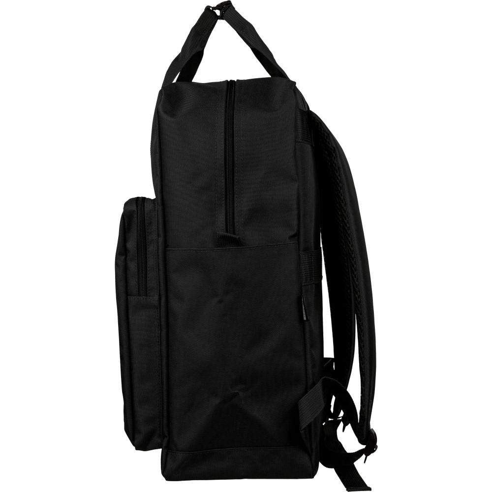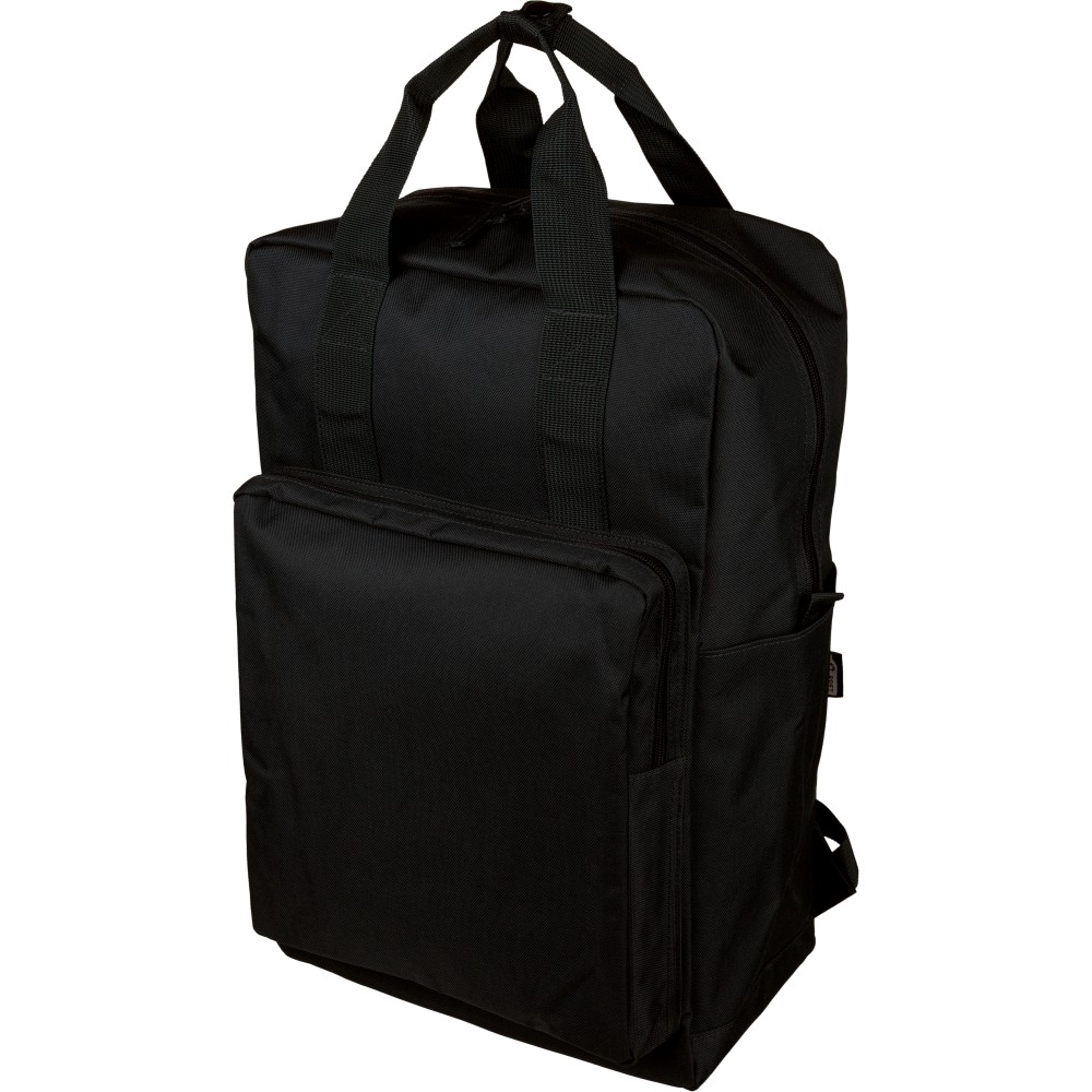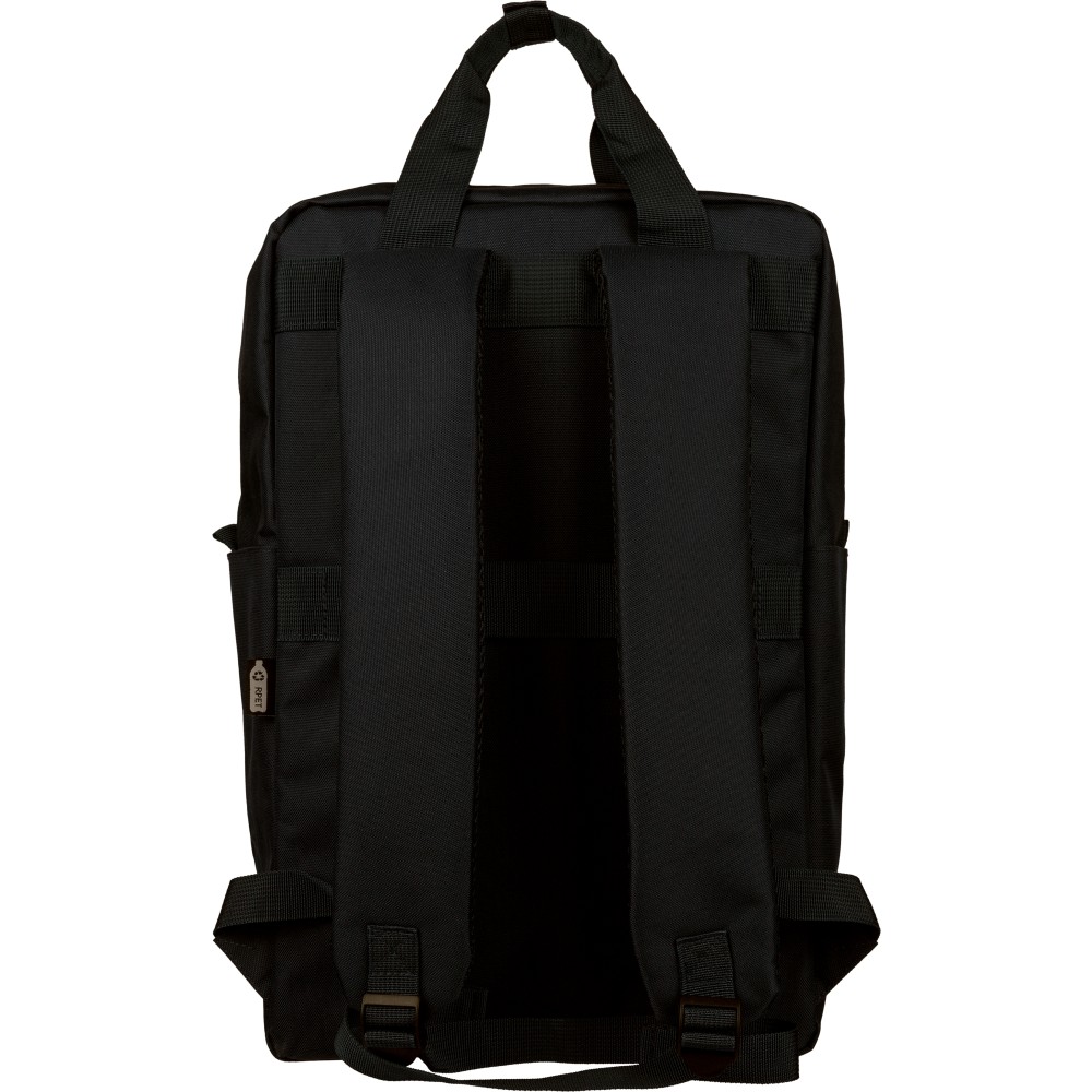 Recycled 900D polyester backpack with 210D lining and rPET label. Includes large main compartment with 16? laptop pocket, front compartment, two side pockets, trolley strap, top handles with button, and ventilated shoulder straps.