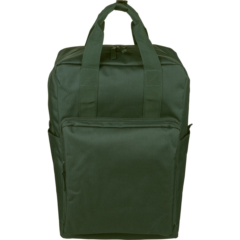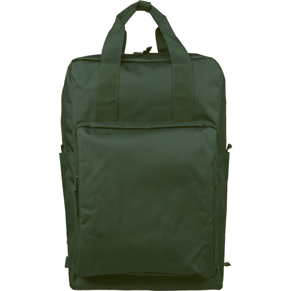 Recycled 900D polyester backpack with 210D lining and rPET label. Includes large main compartment with 16? laptop pocket, front compartment, two side pockets, trolley strap, top handles with button, and ventilated shoulder straps.