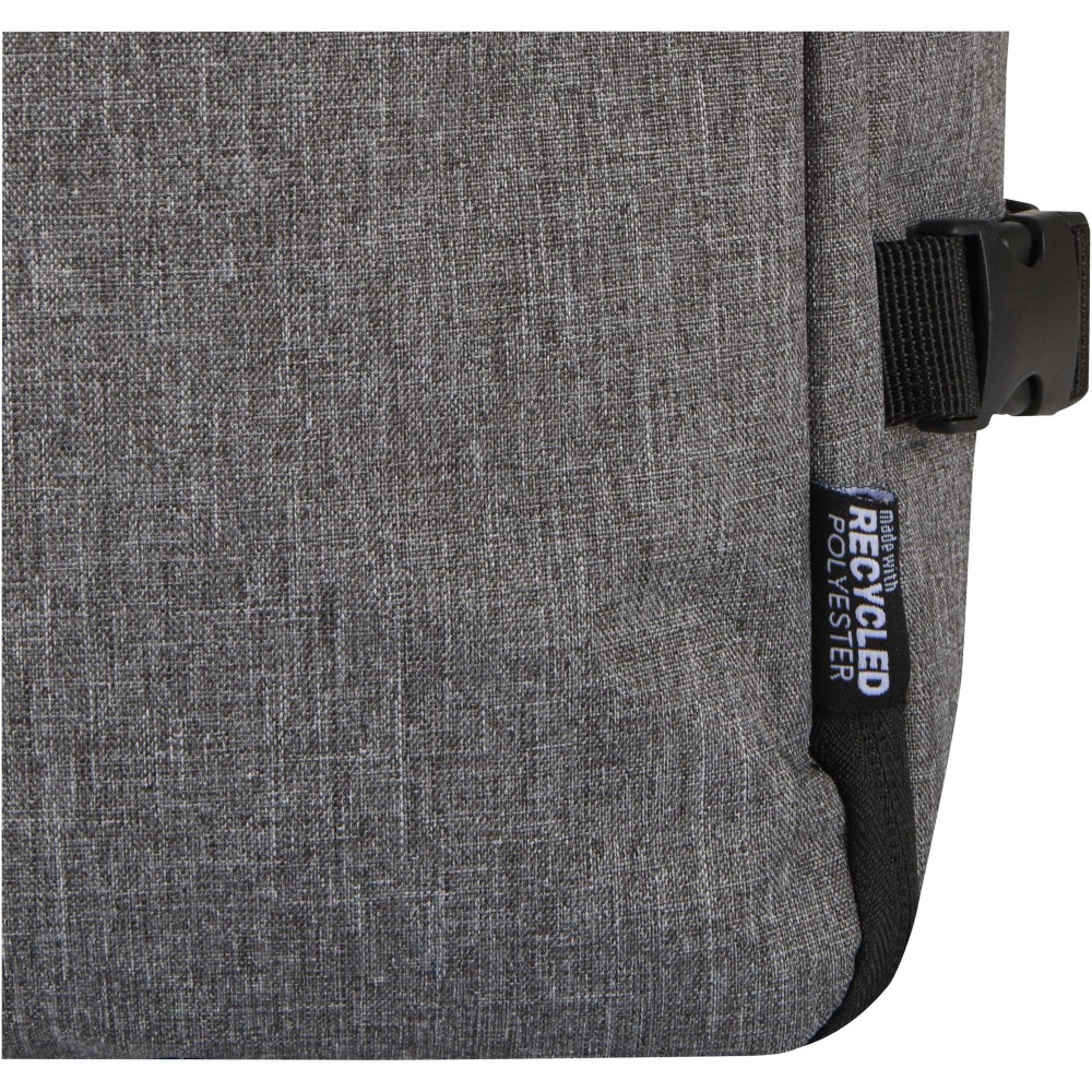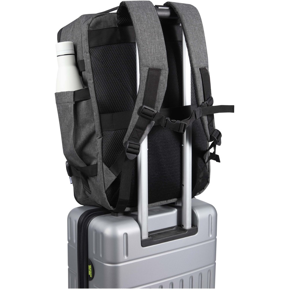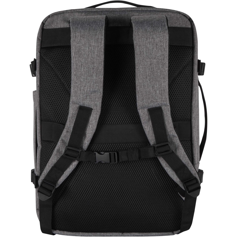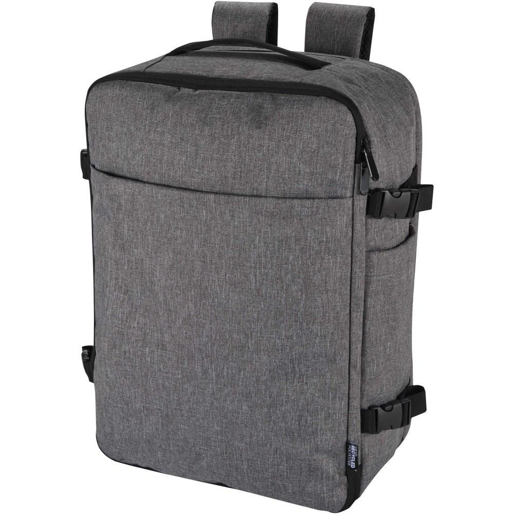 Made from GRS certified recycled polyester with an RPET lining, the Libra 17" carry-on backpack is designed to comply with airline cabin luggage requirements, making it an ideal travel companion. It includes a dedicated laptop compartment for devices up to 17", a spacious main section with elastic straps and mesh dividers to keep belongings secure and organised, and two large front zippered pockets for easy access to essentials. For comfort and convenience, the backpack features a breathable back panel, a trolley strap, adjustable shoulder straps with a cross-chest strap, and both top and side handles for versatile carrying options. Suitable for business trips, remote work, or weekend travel, this backpack combines a sleek design with practical functionality for life on the move.