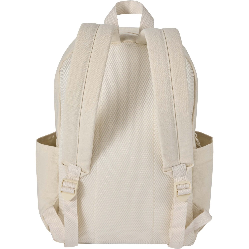 Made from GRS certified recycled water-repellent canvas with a colour-matched RPET lining, the Recanvas city backpack combines style with everyday practicality. It includes a padded 15.6" laptop compartment with an additional padded sleeve, a zipped front pocket, two side pockets, a breathable mesh back, and adjustable shoulder straps for comfort. With a 16-litre capacity, it is ideal for commuting, studying, or day-to-day use.