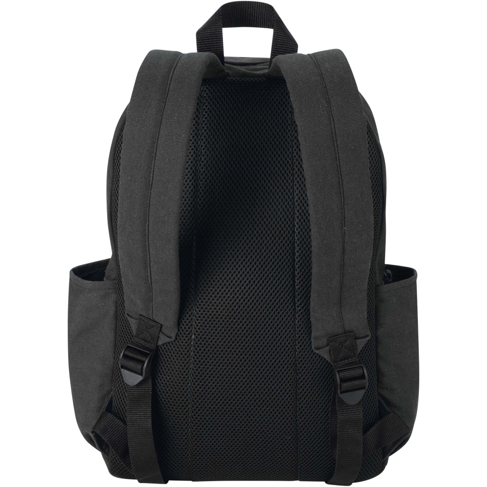 Made from GRS certified recycled water-repellent canvas with a colour-matched RPET lining, the Recanvas city backpack combines style with everyday practicality. It includes a padded 15.6" laptop compartment with an additional padded sleeve, a zipped front pocket, two side pockets, a breathable mesh back, and adjustable shoulder straps for comfort. With a 16-litre capacity, it is ideal for commuting, studying, or day-to-day use.