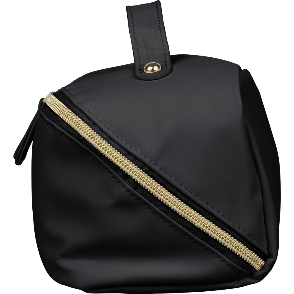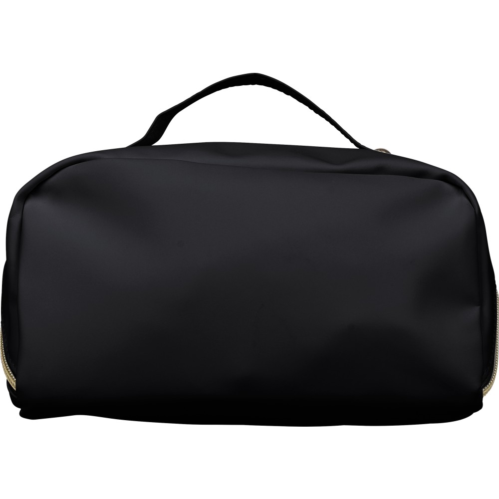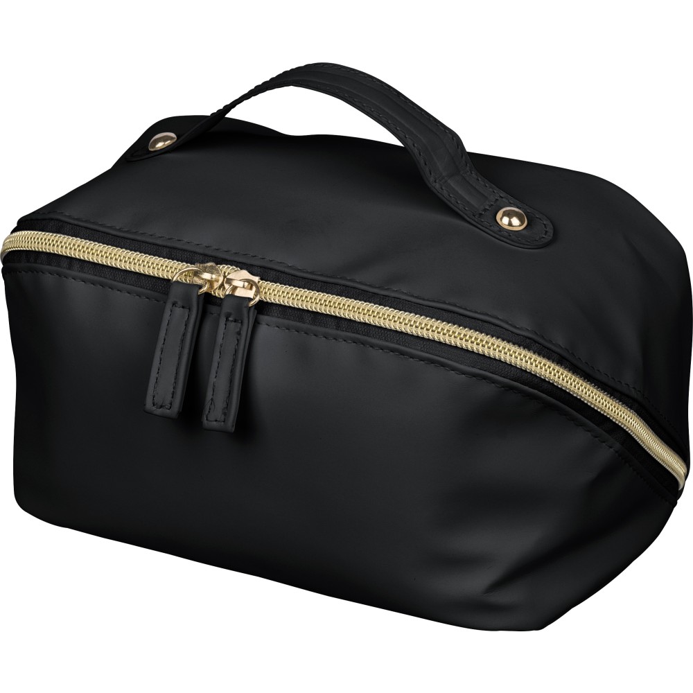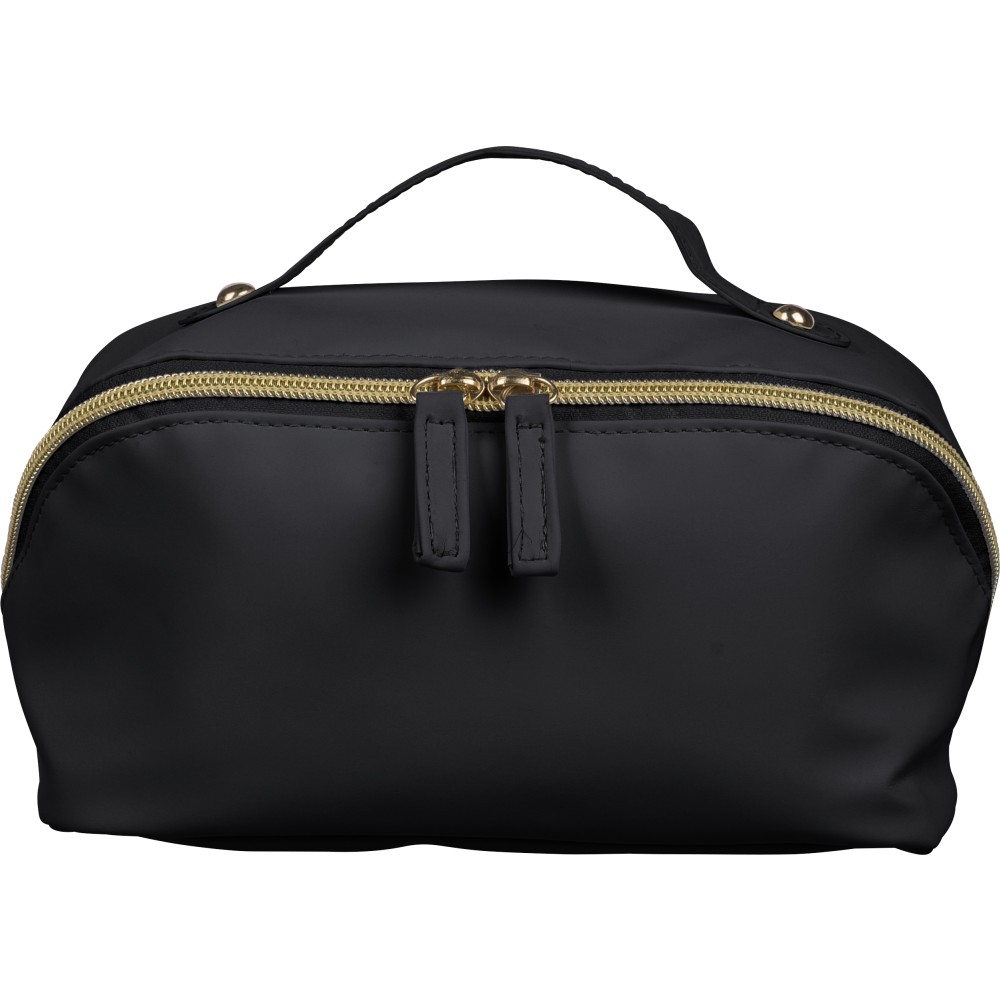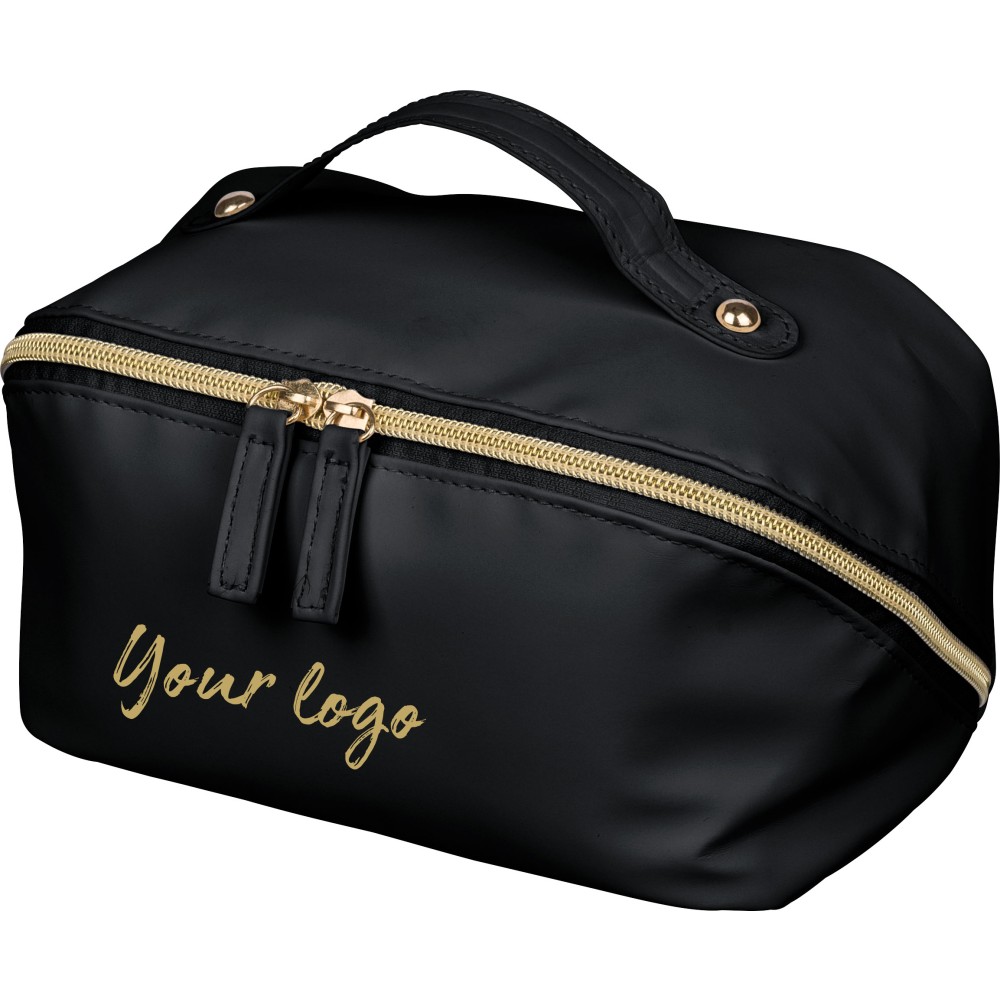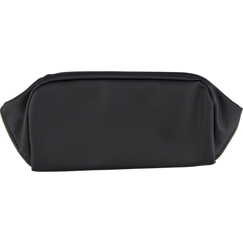 Recycled PU toilet bag with central zipper for wide opening. Features short handle, spacious interior with four compartments, including one inner zip pocket. Finished with 210D recycled lining and single recycled label inside.