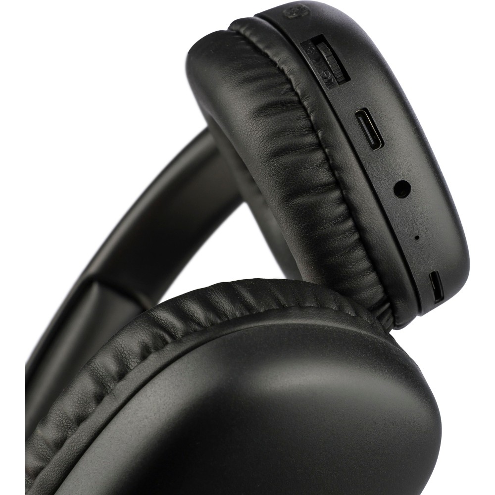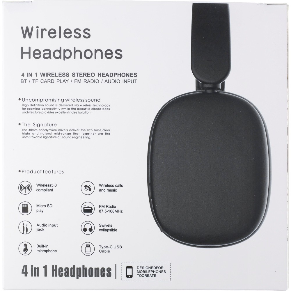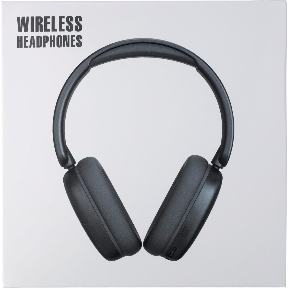 ABS on-ear wireless headphones with a 250mAh capacity battery. Type-C connection. Playback time of approx. 10 hours, with a standby time of approx. 200 hours. Charging time is 2 hours. Features FM radio, TD card insert, and wireless connection technology 5.3. Frequency range: 20-20,000 Hz. 32 Ohms, decibel rating: 105 dB š 3 dB. Wireless operating distance: 10-20 meters. Packaged per piece, including charging cable and manual, in a gift box. Printing: Pad printing