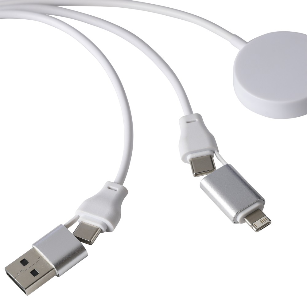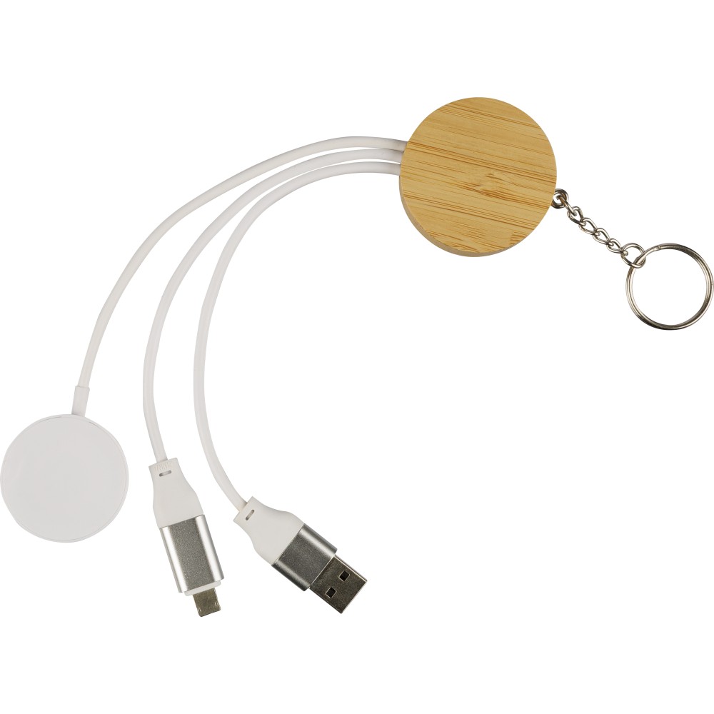 TPE charging cable set with bamboo socket and metal keyring in a compact keychain design. Includes PD 65W fast charging cables (2-in-1 Type-C/Lightning and USB-A/USB-C) and a universal smartwatch charger. Packed in a brown cardboard box.