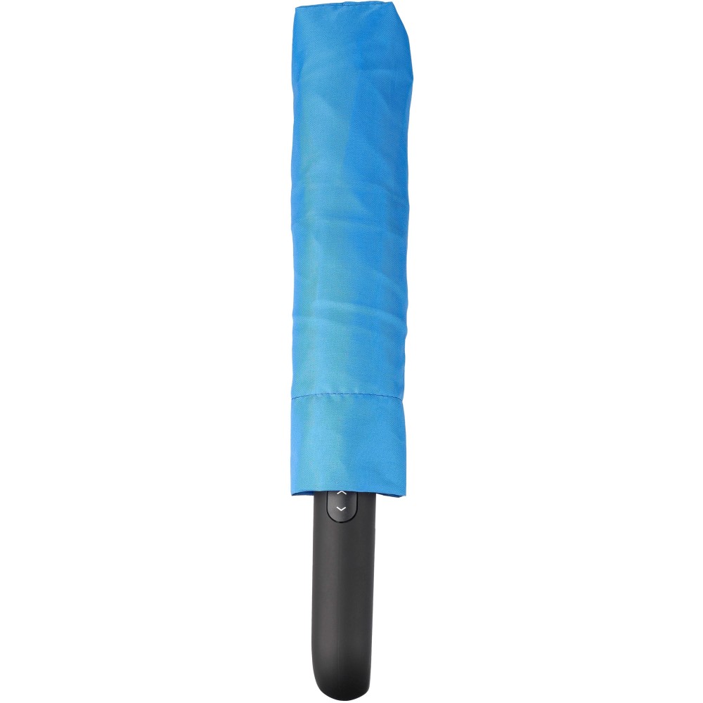 rPET 190T foldable automatic umbrella (21 inch) with six panels and a steel frame. Features an rPET label on the Velcro closure and a plastic carabiner handle. Includes pouch. Windproof. Printing: Screen-printing