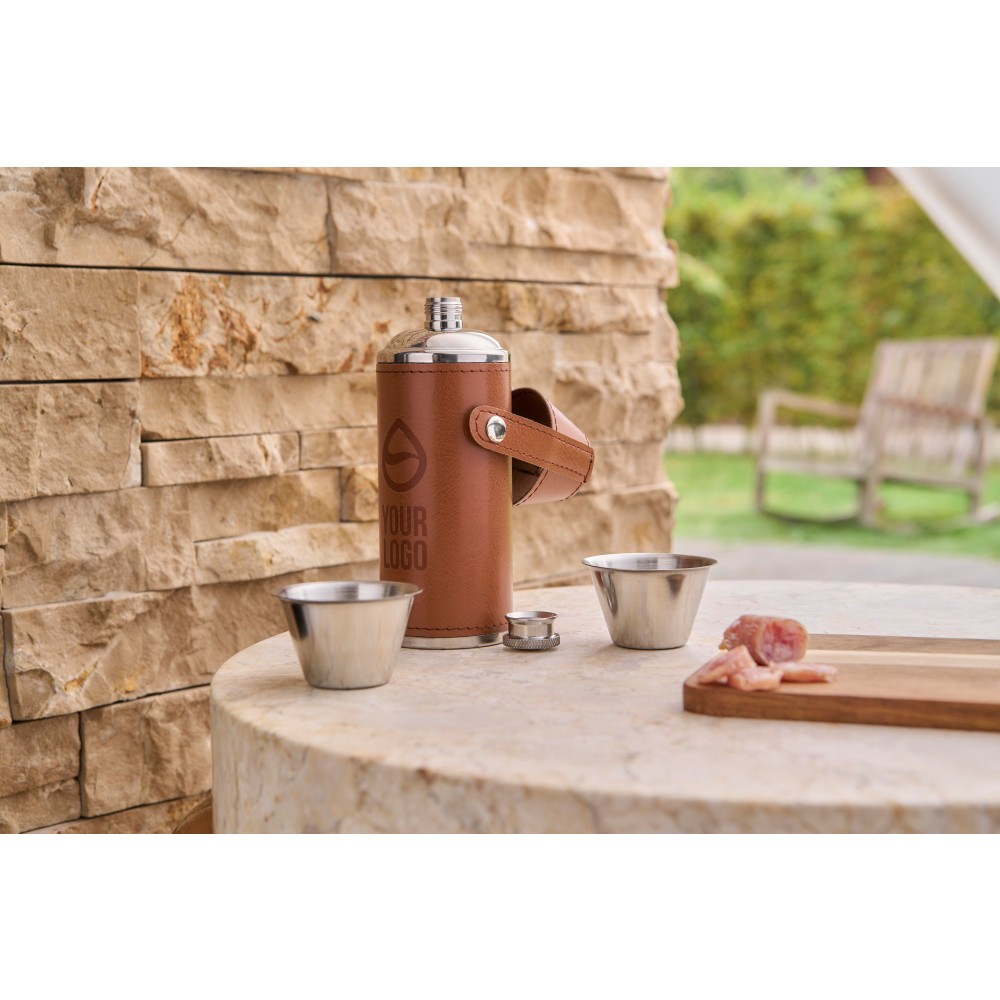 Recycled stainless steel flask (230 ml) with two cups (40 ml) and PU sleeve on the outside. Made of stainless steel 304. The cups are attached on top via push buttons. Individually packaged in a brown cardboard box. Printing: Engraving