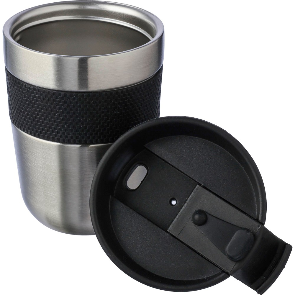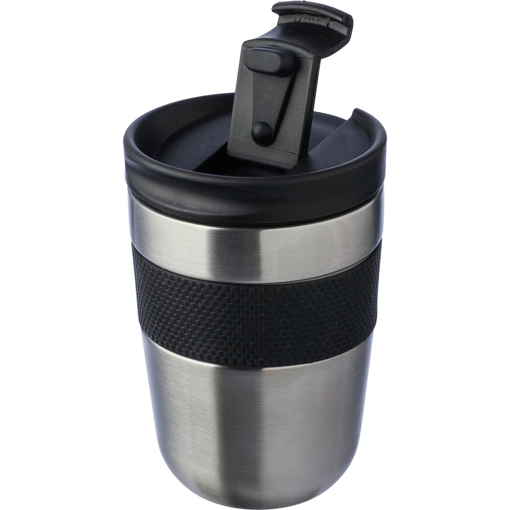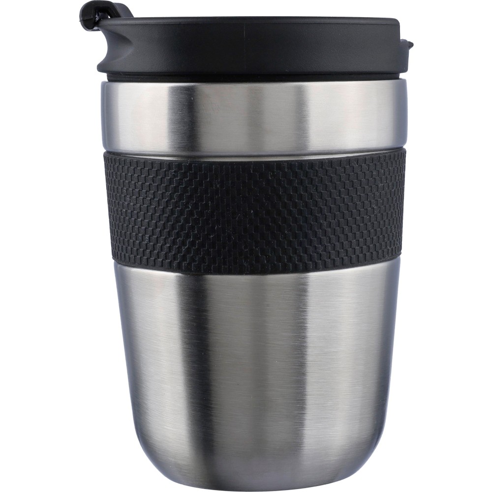 Stainless steel double-walled drinking mug (300 ml) with a PP lid and silicone grip. Keeps contents hot for 4 hours and cold for 6 hours. The interior is made of stainless steel 304, and the exterior is stainless steel 201. Individually packaged in a brown cardboard box. Printing: Engraving