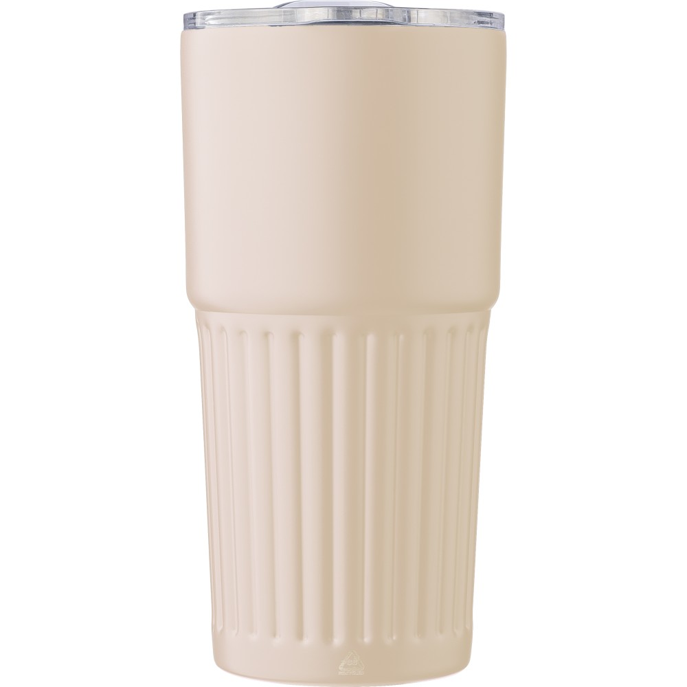 Recycled stainless steel double-walled drinking mug (500 ml). The interior is made of stainless steel 304 and the exterior is stainless steel 201 with a ridge grip design. Features an AS lid with a slide closure. Includes an engraved recycled logo on the body. Individually packaged in a brown cardboard box. Printing: Screenround
