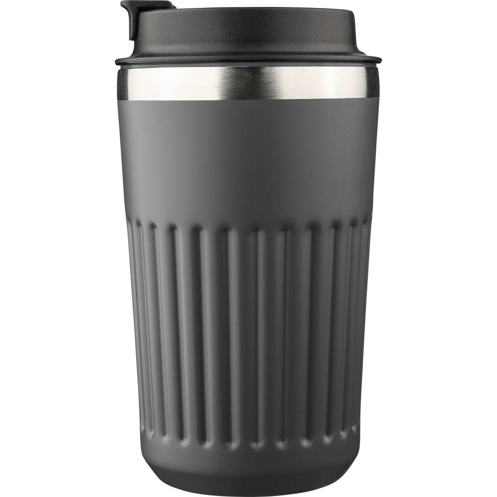 Recycled stainless steel travel mug (400 ml) with double wall and outer ridges. Inner 304 stainless steel, outer 201 stainless steel, with PP lid. Engraved recycled logo on the body. Packed in brown cardboard box. Printing: Engraving, Pad printing