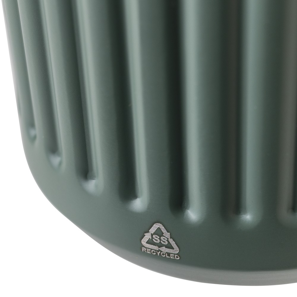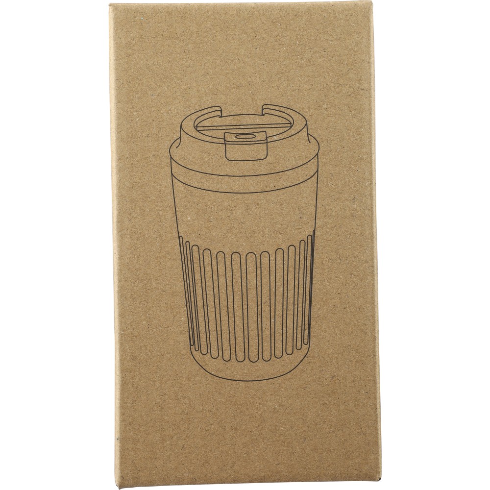 Recycled stainless steel travel mug (400 ml) with double wall and outer ridges. Inner 304 stainless steel, outer 201 stainless steel, with PP lid. Engraved recycled logo on the body. Packed in brown cardboard box. Printing: Engraving, Pad printing