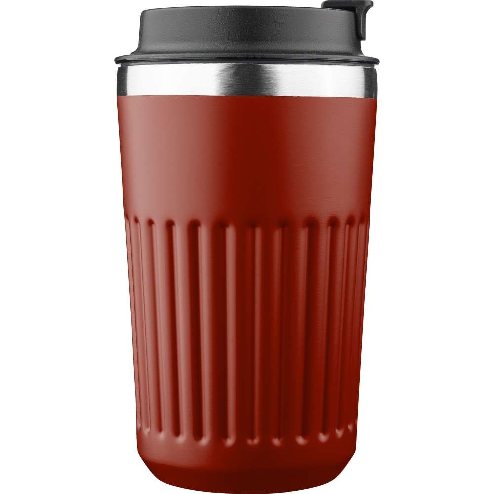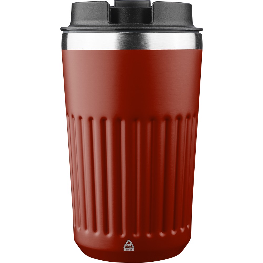 Recycled stainless steel travel mug (400 ml) with double wall and outer ridges. Inner 304 stainless steel, outer 201 stainless steel, with PP lid. Engraved recycled logo on the body. Packed in brown cardboard box. Printing: Engraving, Pad printing