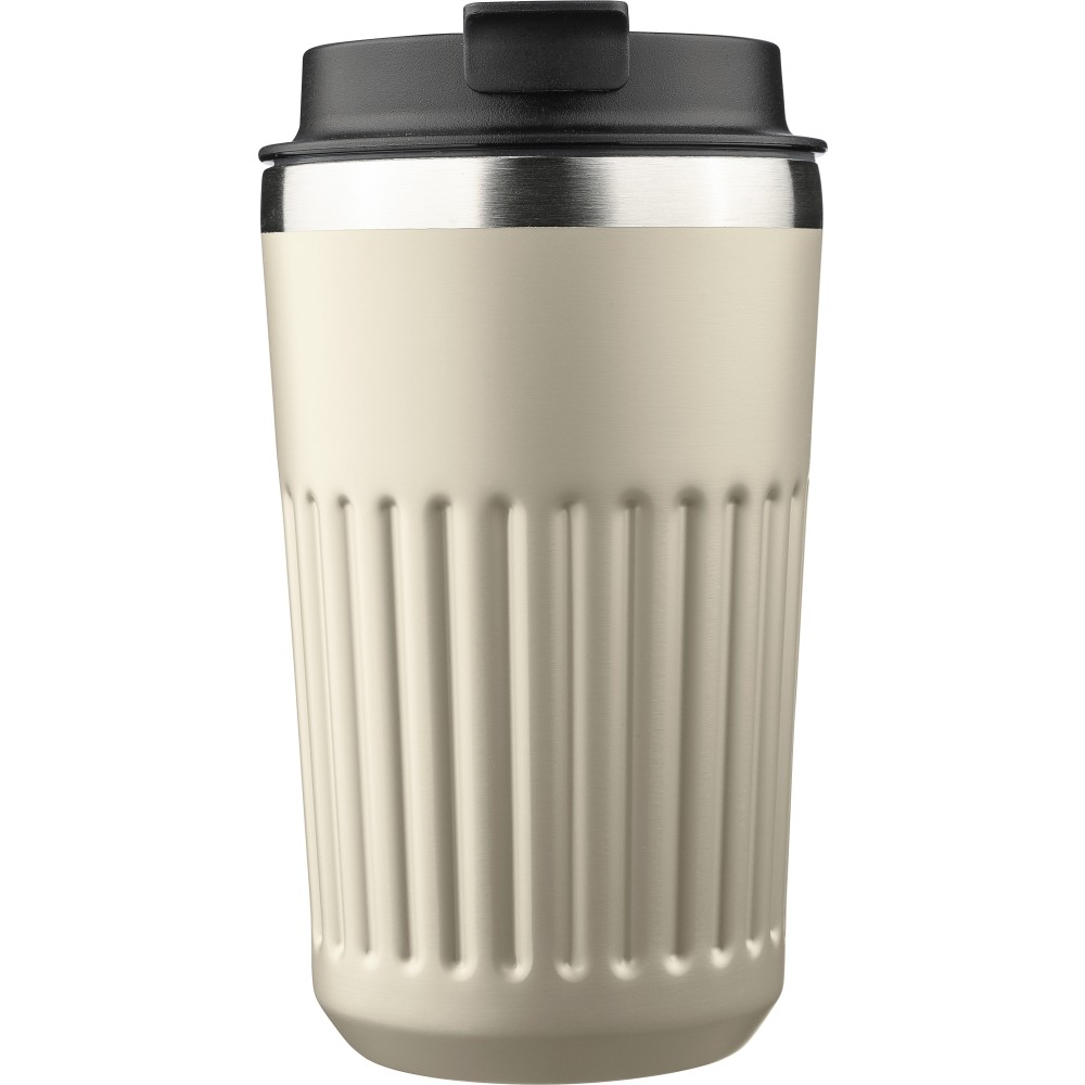 Recycled stainless steel travel mug (400 ml) with double wall and outer ridges. Inner 304 stainless steel, outer 201 stainless steel, with PP lid. Engraved recycled logo on the body. Packed in brown cardboard box. Printing: Engraving, Pad printing