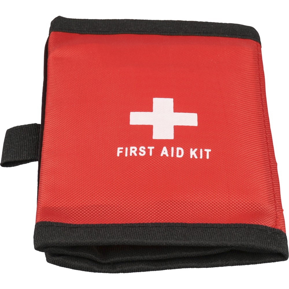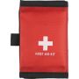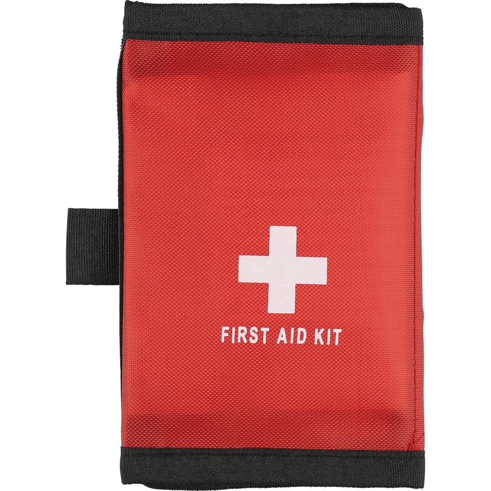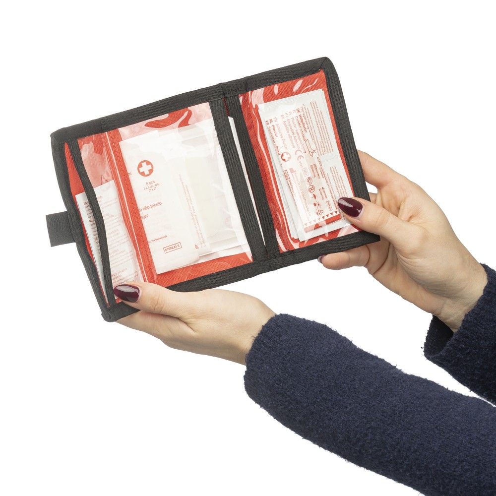 rPET 600D polyester first aid pouch with velcro closure and carrying loop. Includes PVC pockets and 17 parts: 5 plasters, 1 sterile film dressing, 1 non-woven sponge, 8 alcohol pads, 2 cleaning towelettes. Finished with rPET label outside.