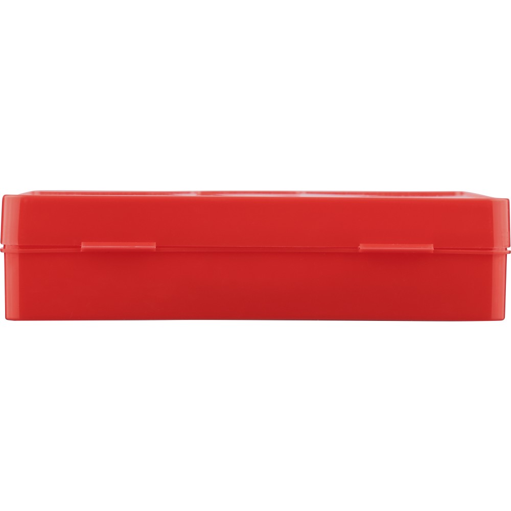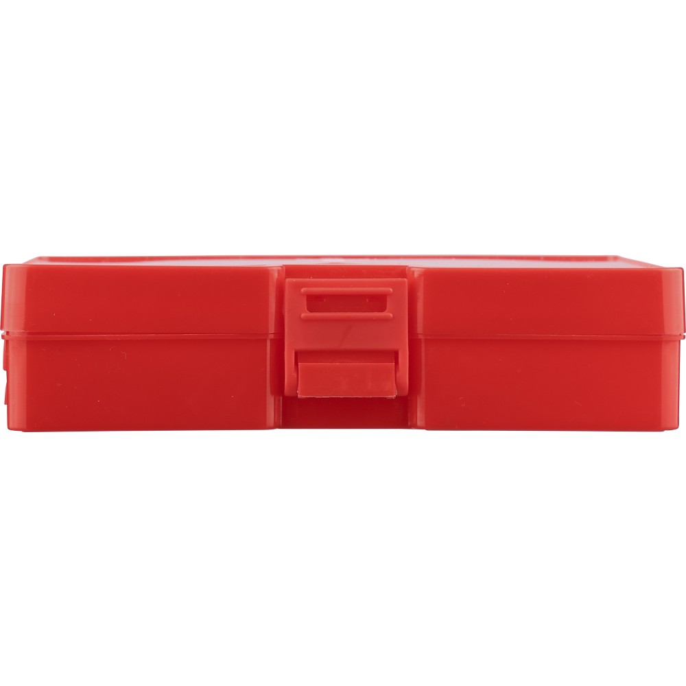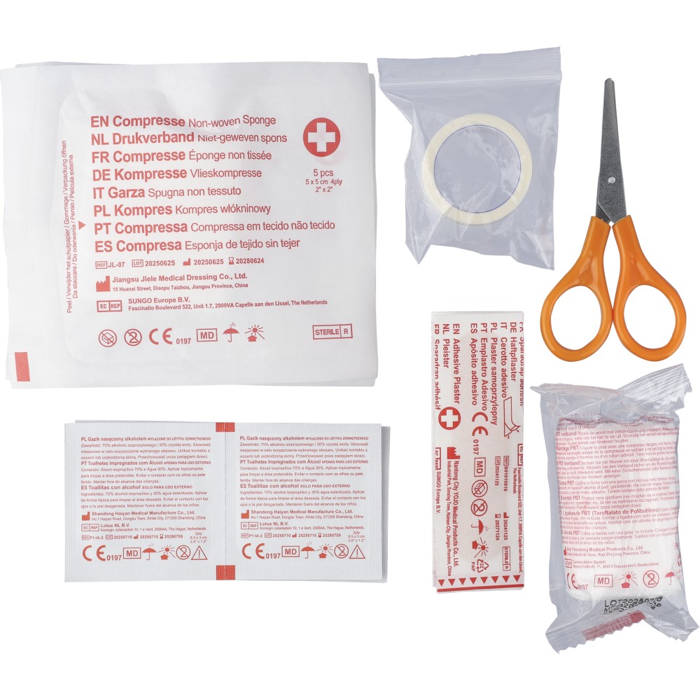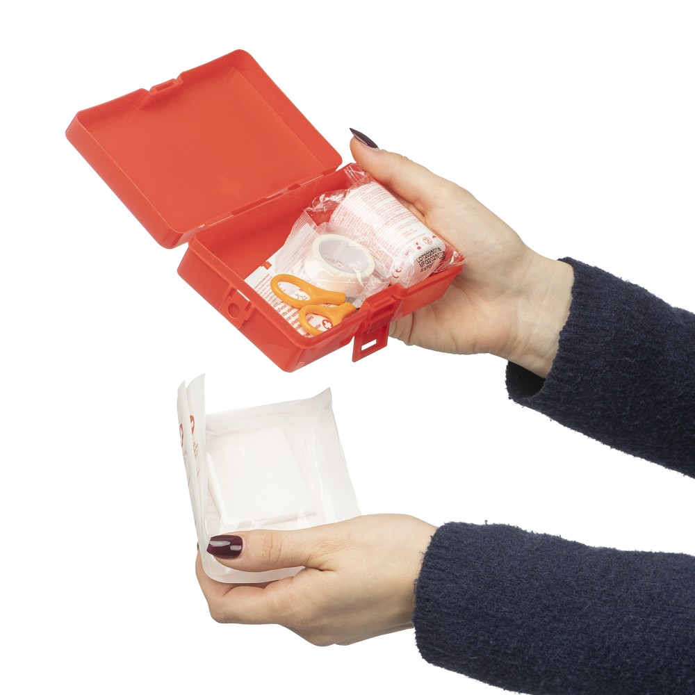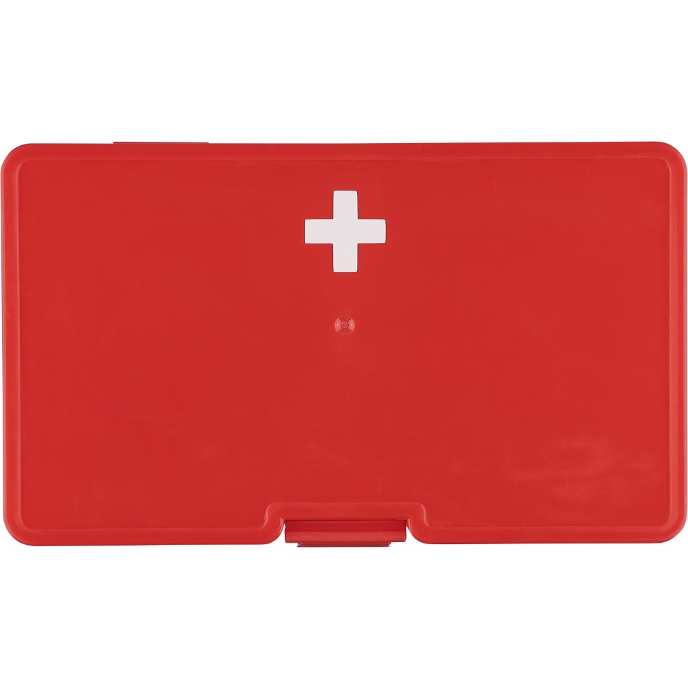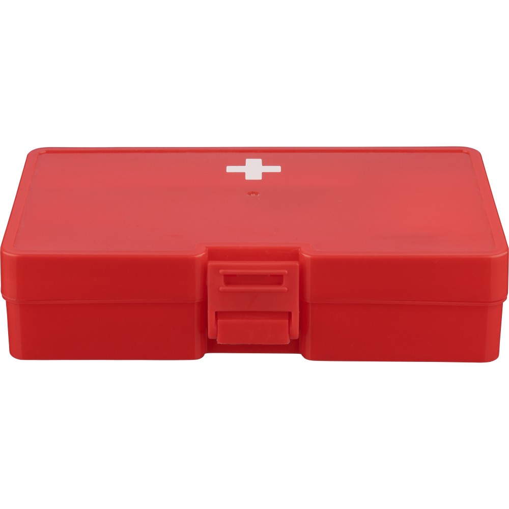PP first aid set in red case with white cross on the topside and clip closing. Compact cassette design containing 15 parts: 2 non-woven sponges, 5 bandages, 4 alcohol pads, 1 pair of scissors, 1 roll gauze bandage (450 cm) and 1 roll of tape (450 cm).