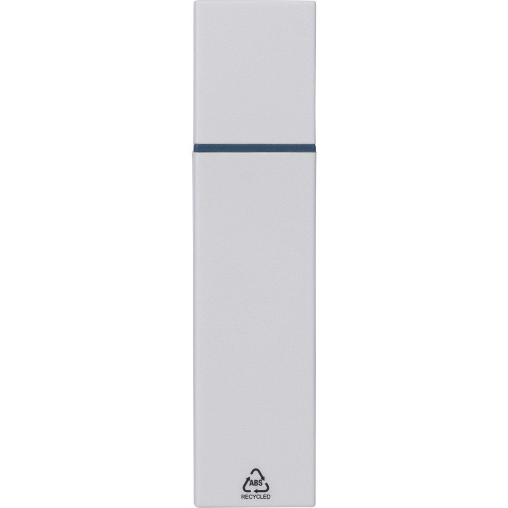 Recycled ABS text marker with white body and colored detail. Features a click closure and includes a 2-year warranty against drying out. Marked with the Recycled ABS logo.
