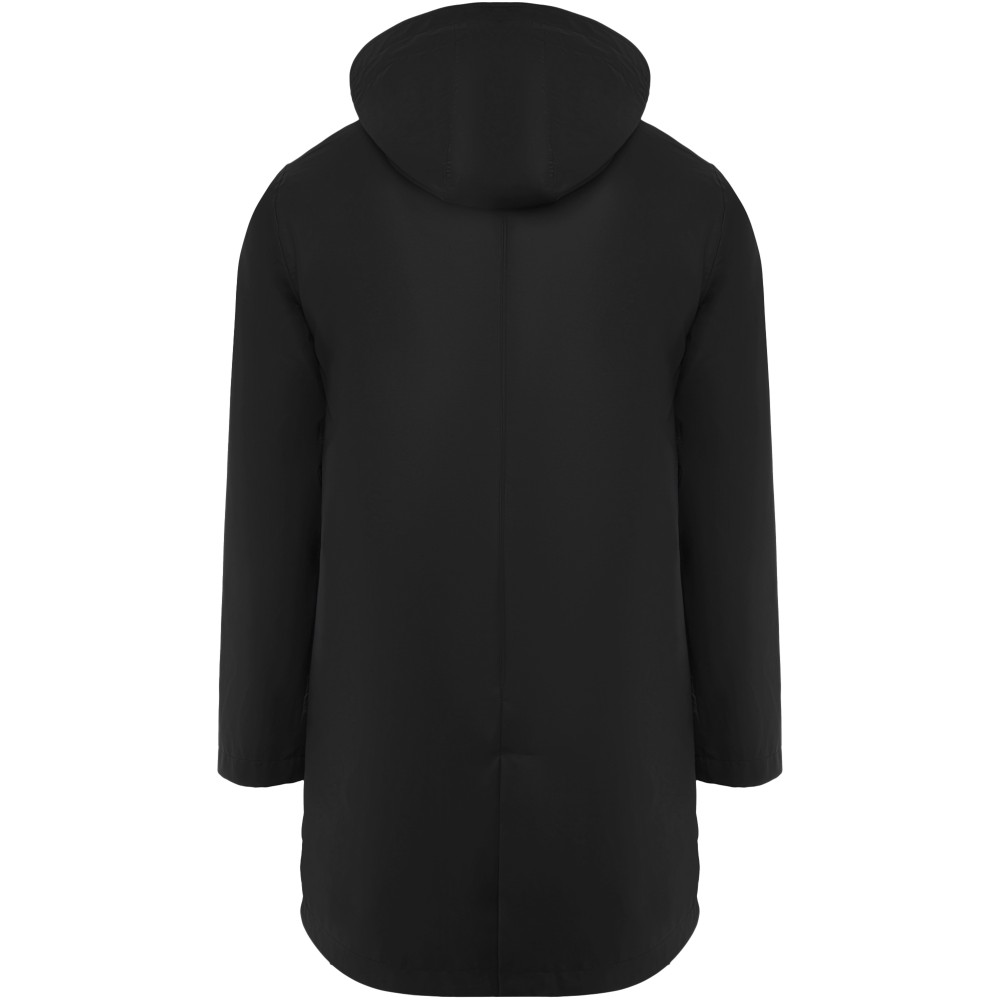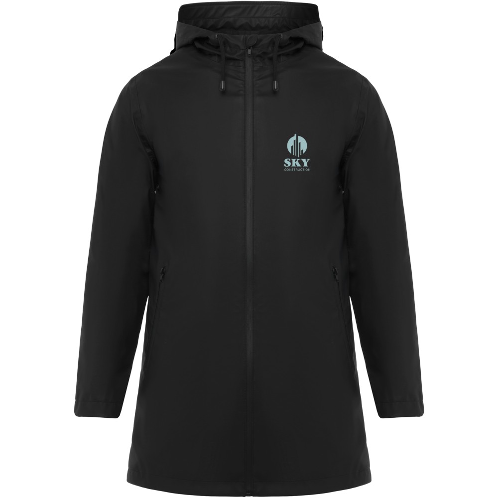 Waterproof raincoat. Hood with peak. Heat-sealed zips and seams. Contrasting details in black. Two side pockets with zip. Slit on back hem. Removable label. Waterproof. The model is 185 cm and is wearing size M. Polyurethaan of 100% Polyester, 210 g/m2. Printing: Embroidery, Screen-printing
