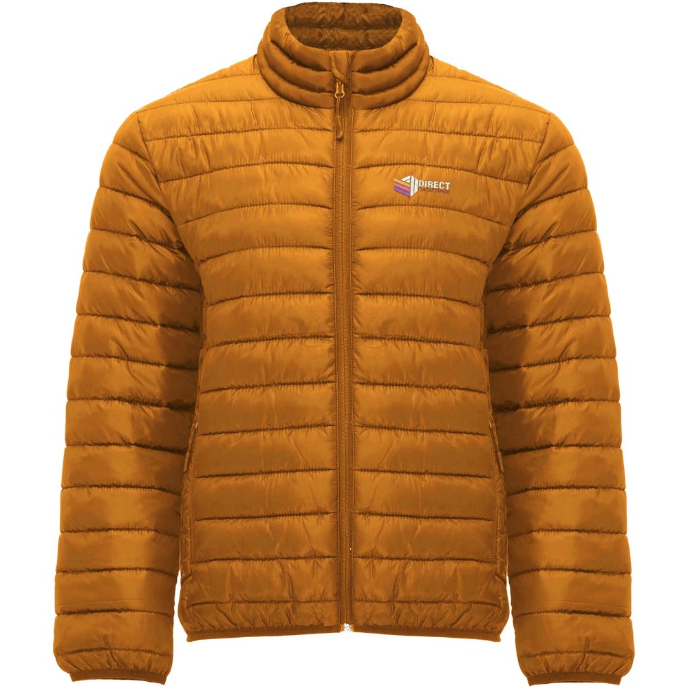 Men's quilted jacket with feather touch padding. Inverted zippers with matching chin protector and puller. Two front pockets with zippers. Matching elastic edging in collar, cuffs and hem. Contrasting inner lining. Includes stow carry bag. Lightweight and foldable garment. Removable label. Water resistant. Wind-proof. The model is 184 cm and is wearing size L. Printing: Embroidery