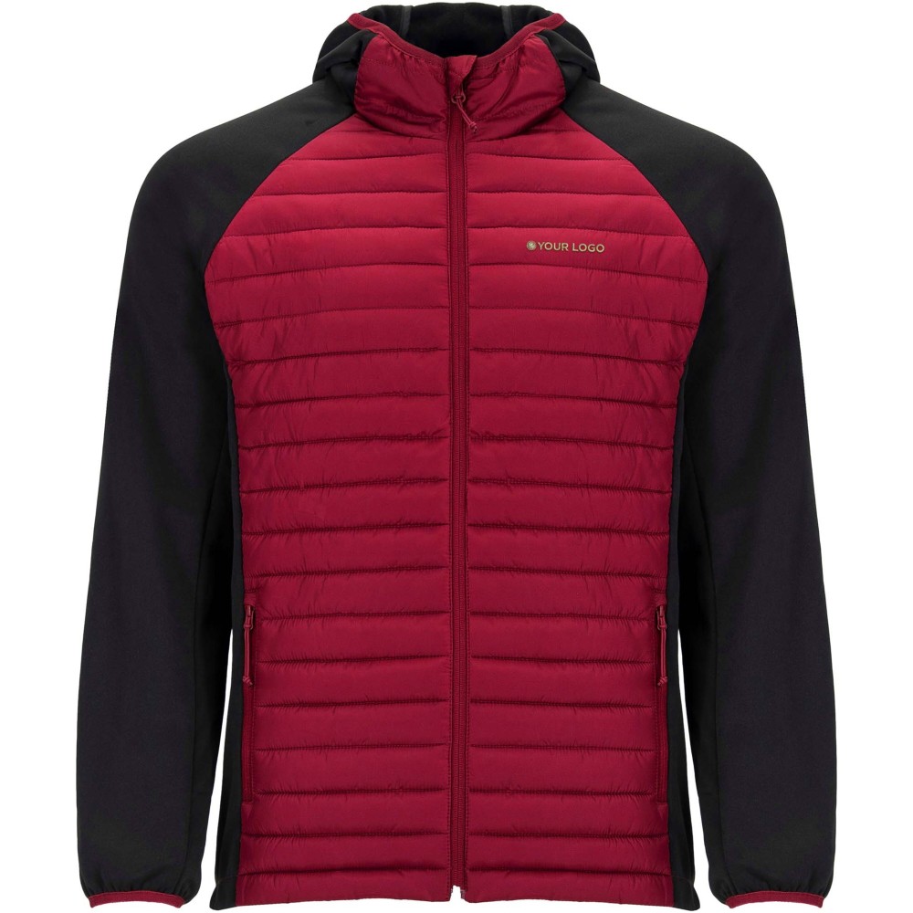 Unisex jacket in two-fabric combination: Fixed adjusted hood. Raglan sleeves. Sleeves, side panels and hood in softshell fabric. Quilted feather touch fabric in front and back. Inverted zip with matching chin protector and puller. Two front pockets with zippers. Matching elastic trim in collar, cuffs and hem. Removable label. Wind-proof model. The male model is 184 cm and is wearing size L, and the female model is 179 cm and is wearing size S. Printing: Embroidery
