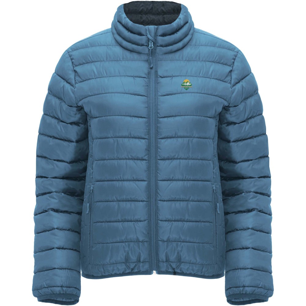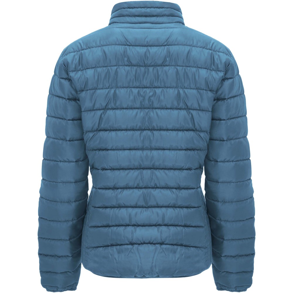 Women's quilted jacket with feather touch padding. Inverted zippers with matching chin protector and puller. Two front pockets with zippers. Matching elastic edging in collar, cuffs and hem. Contrasting inner lining. Includes stow carry bag. Lightweight and foldable garment. Fitted cut. Removable label. Water resistant. Wind-proof. The model is 179 cm and is wearing size S. Printing: Embroidery