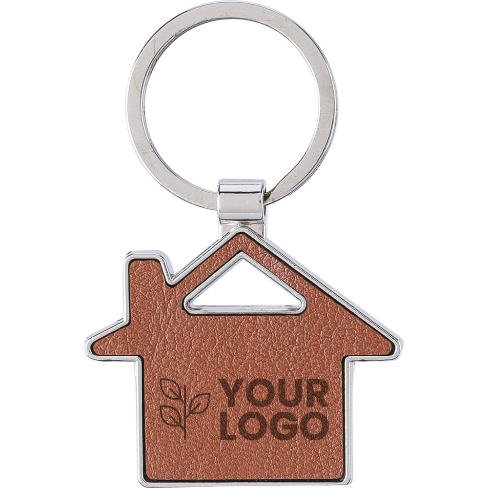 Recycled leather keychain with a metal ring. House shape. Includes embossed recycled leather logo on the side. Individually packaged in a brown cardboard sleeve. Printing: Engraving