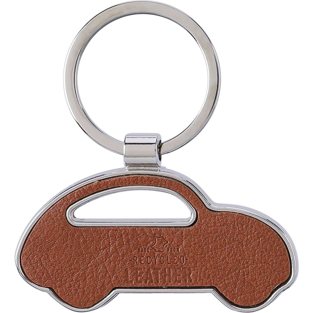 Recycled leather keychain with a metal ring. Car shape. Includes embossed recycled leather logo on the side. Individually packaged in a brown cardboard sleeve. Printing: Engraving