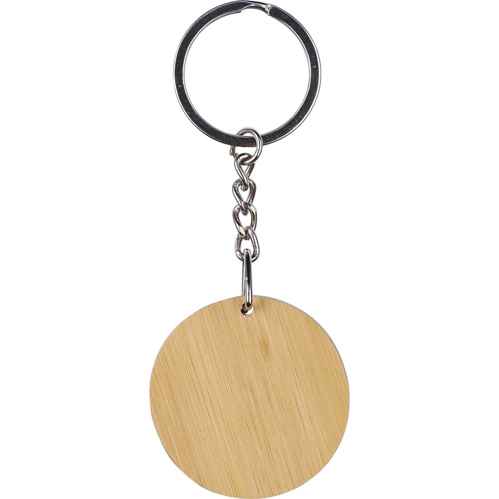 Bamboo keychain with a black rubber-coated stainless steel engraving plate inside, in a round shape. The color after engraving is shiny chrome. Individually packaged in a brown carton envelope. Printing: Pad printing