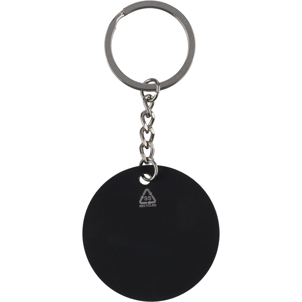 Recycled stainless steel rubberized keychain with metal ring in a round soccer ball design. Features an engraved recycled logo that reveals a shiny mirror effect after engraving. Individually packed in a kraft paper envelope.