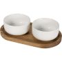 A set of two ceramic serving bowls with a tray made from acacia wood. Ideal for dips, snacks, or sides. Durable, stylish, and perfect for entertaining or everyday use. The bowls are dishwasher safe.