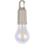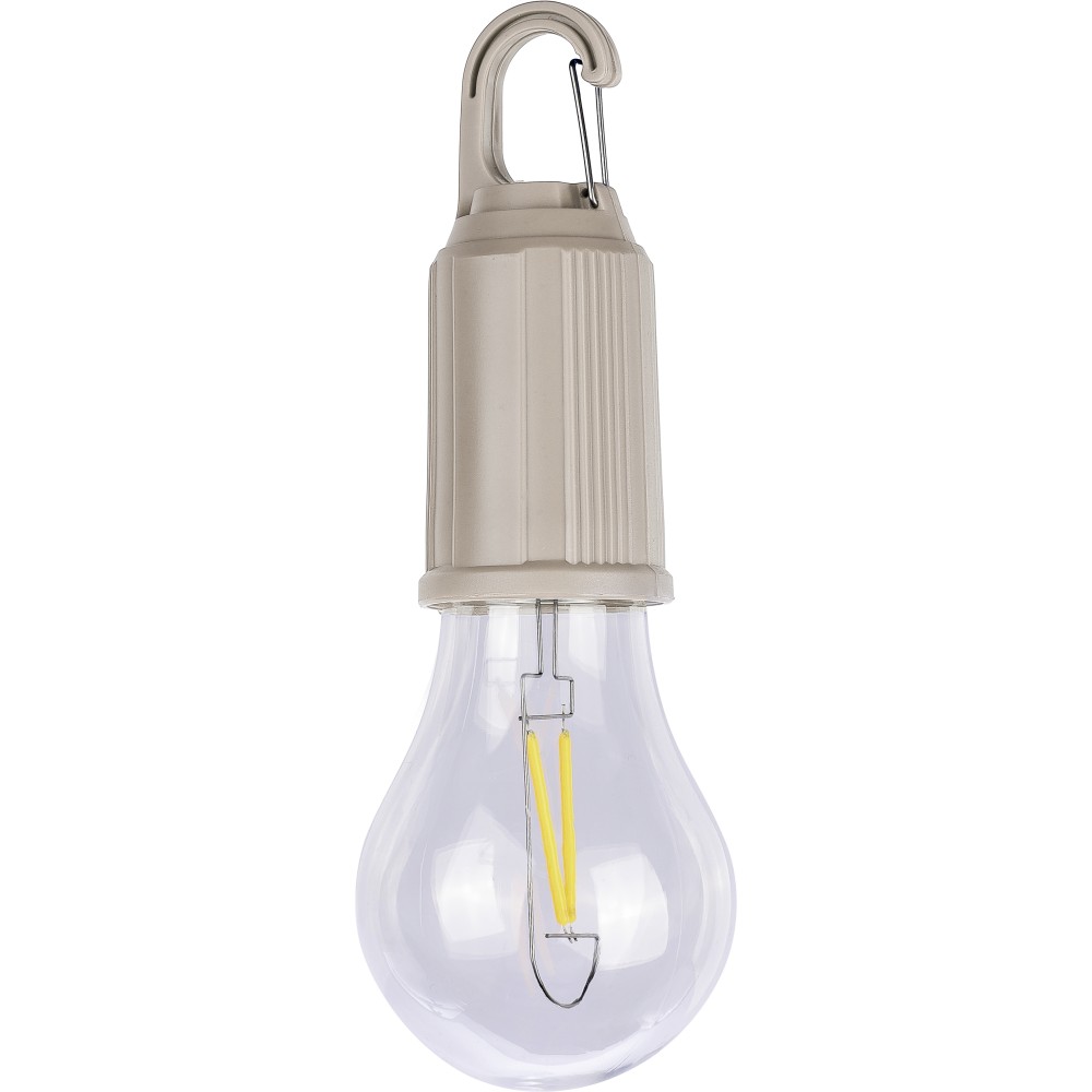 ABS lightbulb (60 lumens) with a 400mAh rechargeable battery. USB-C charging type. Features a metal clip and three light modes. IPX3. Printing: Pad printing