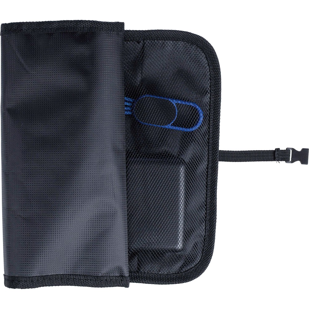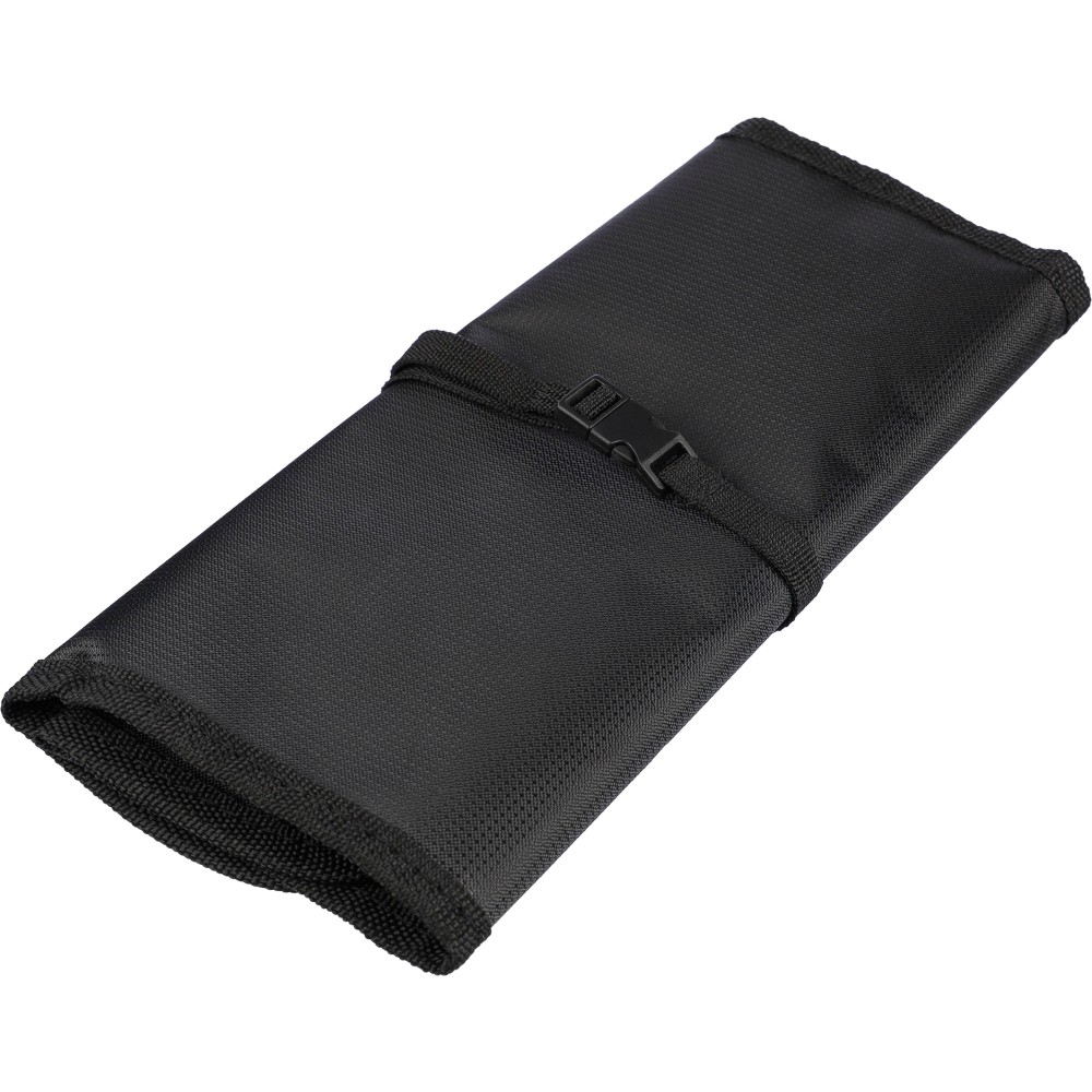 1680D polyester roll-up bag with a plastic buckle. With multiple pockets and zippered compartments inside for storing charging cables or devices. Printing: Screen-printing