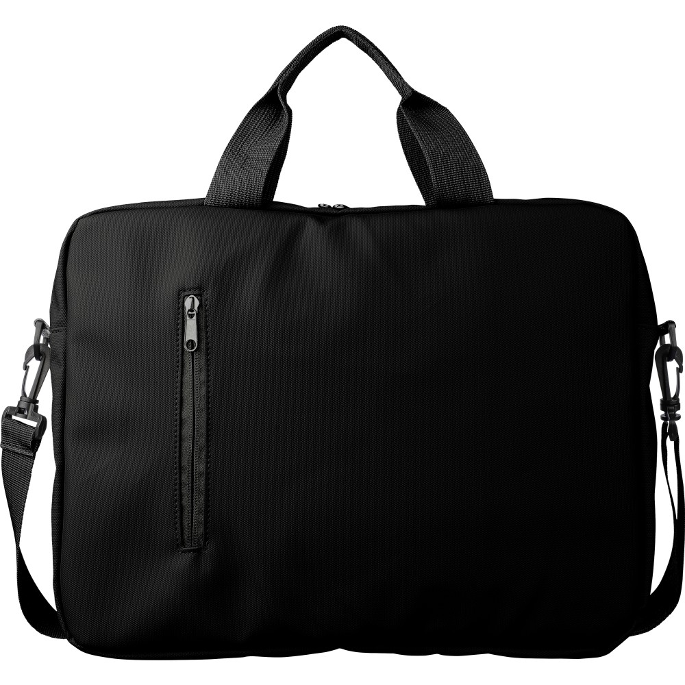 PU laptop bag (15 inch) with two zippered front pockets, a large zippered compartment with a Velcro-closed laptop section, and multiple inserts inside. Includes adjustable carrying straps and two handles. Water repellent. Printing: Screen-printing