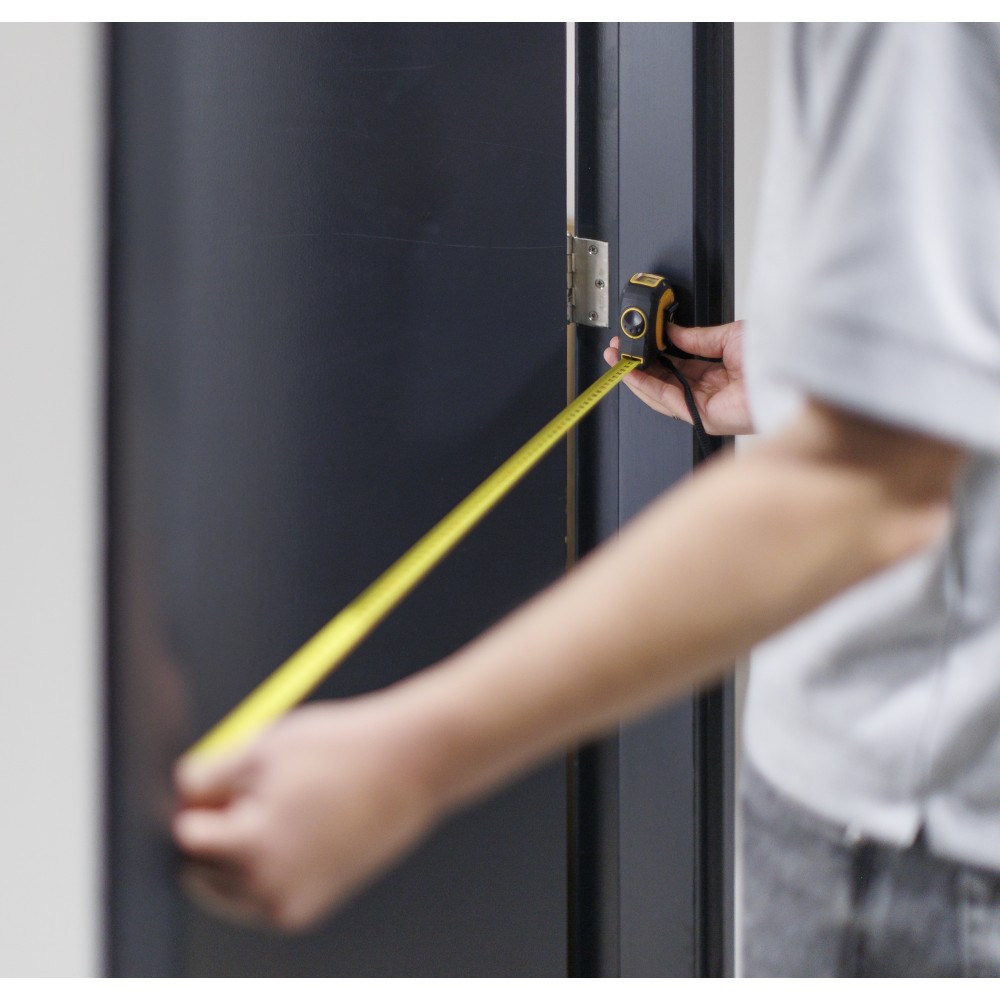 ABS and TPR tape measure with 3 m long, 16 mm wide double-sided metal tape. Transparent top window for precise inside measurements. Includes lock/release function, back clip, and polyester wrist strap. Packed in brown carton box with illustration.