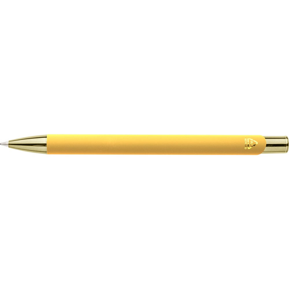 Recycled aluminium rubberized ballpen with matching UV-coated plastic and metal details. Shiny mirror effect appears after engraving. Features engraved recycled logo and writes approx. 800 metres. Blue ink.
