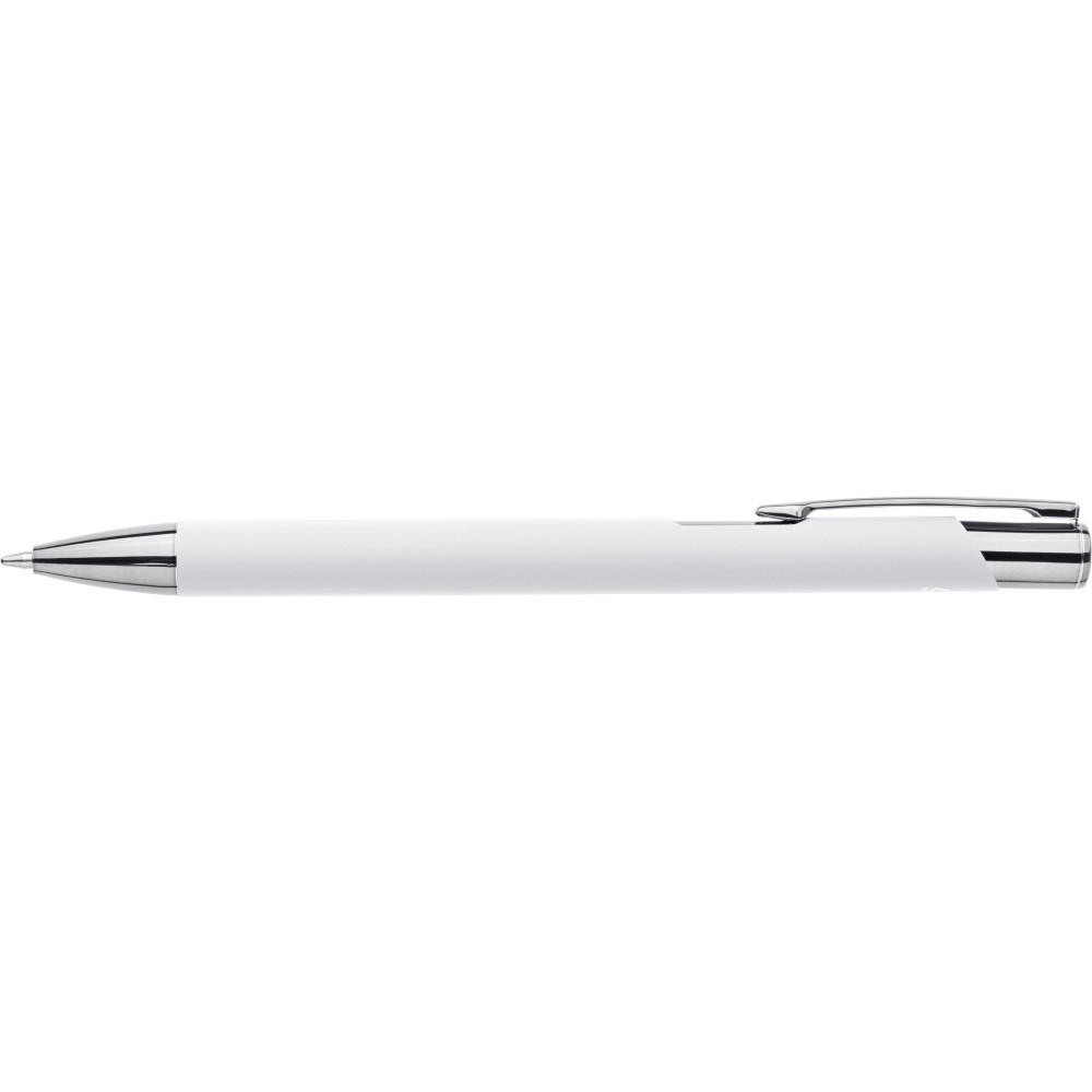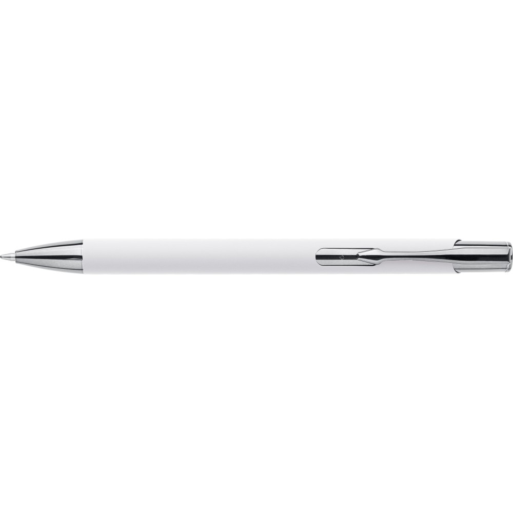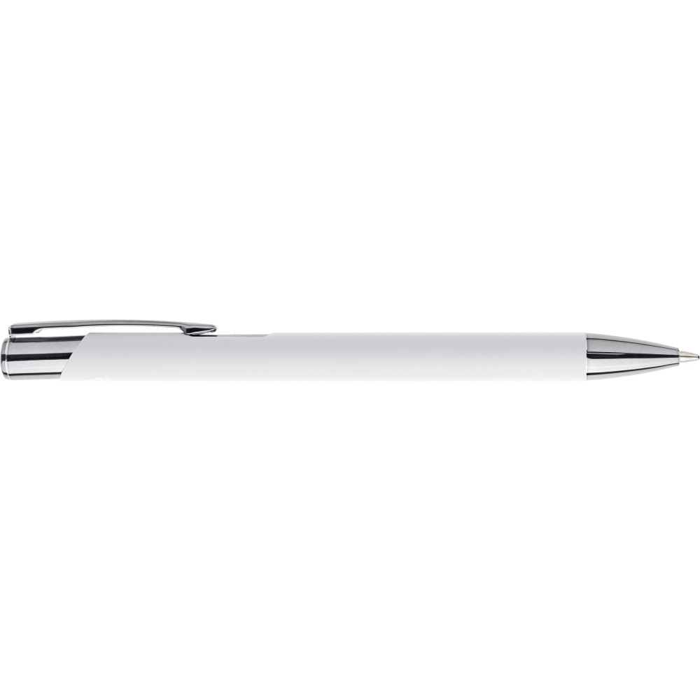 Recycled aluminium rubberized ballpen with matching UV-coated plastic and metal details. Shiny mirror effect appears after engraving. Features engraved recycled logo and writes approx. 800 metres. Blue ink.