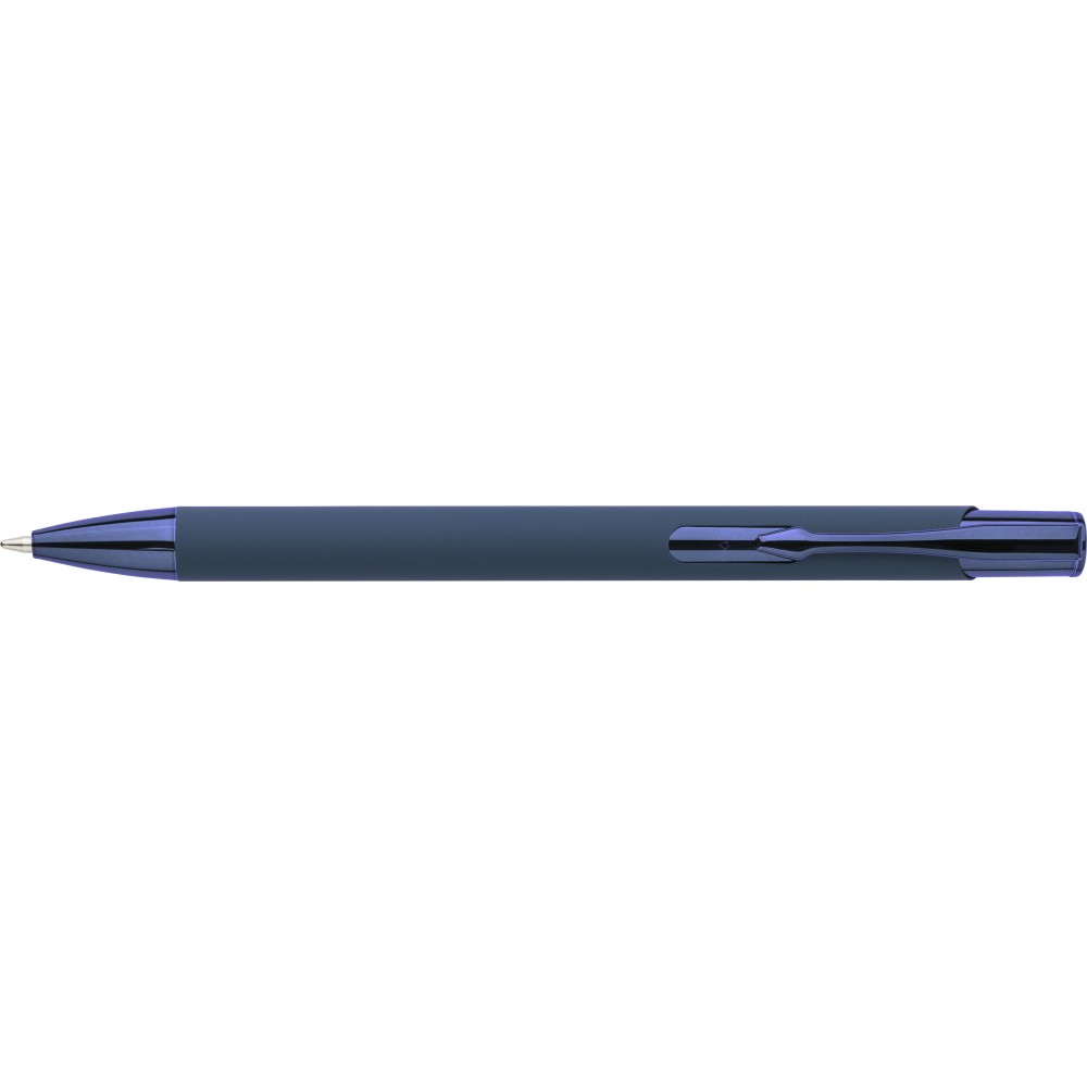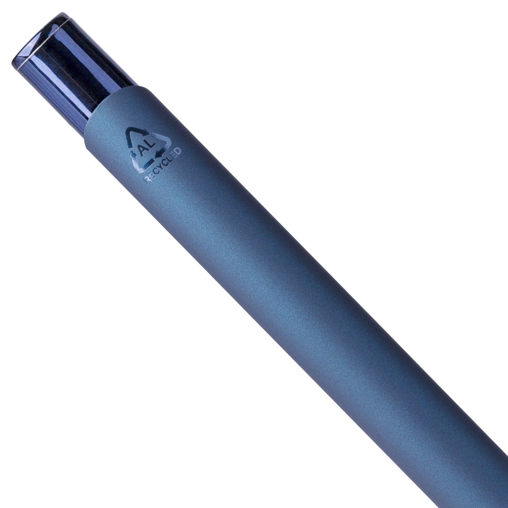 Recycled aluminium rubberized ballpen with matching UV-coated plastic and metal details. Shiny mirror effect appears after engraving. Features engraved recycled logo and writes approx. 800 metres. Blue ink.