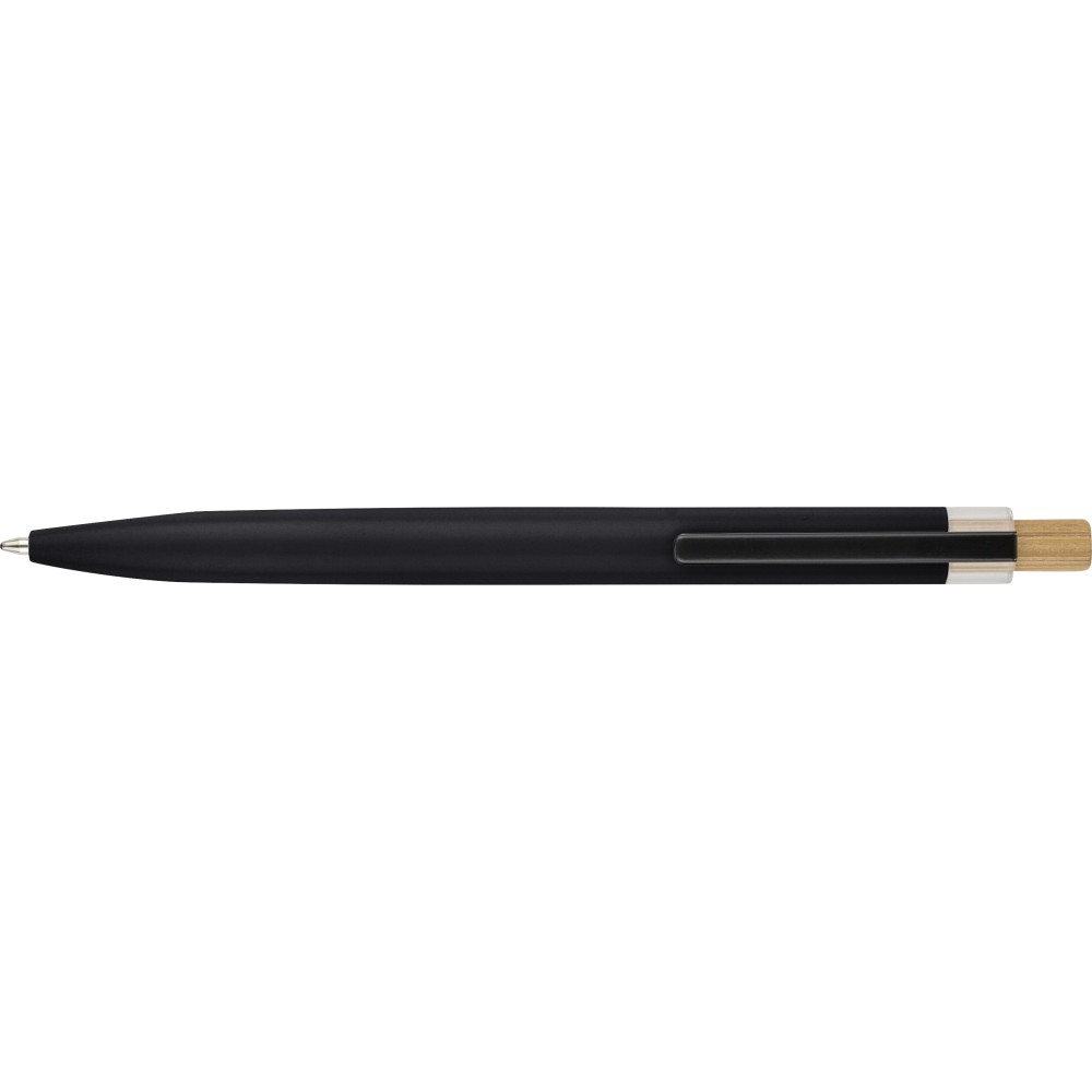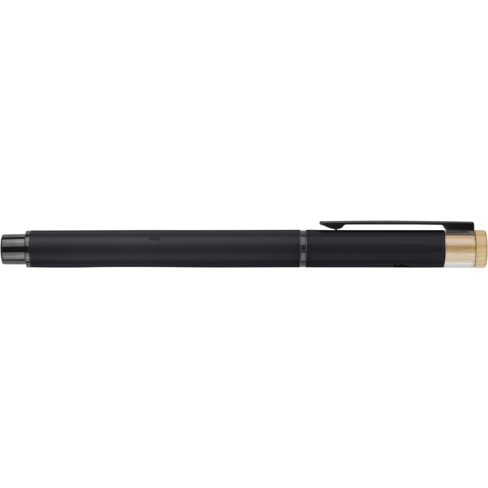 Recycled aluminium lacquered pen set with ballpen and roller pen. Features bamboo pusher, rPET trim, and metal clip; roller pen includes bamboo/rPET cap detail and matching clip. Both with engraved recycled logo. Writes approx. 700 m (ballpen) and 500 m (roller pen). Blue ink. Packed in colored recycled cardboard gift box.