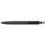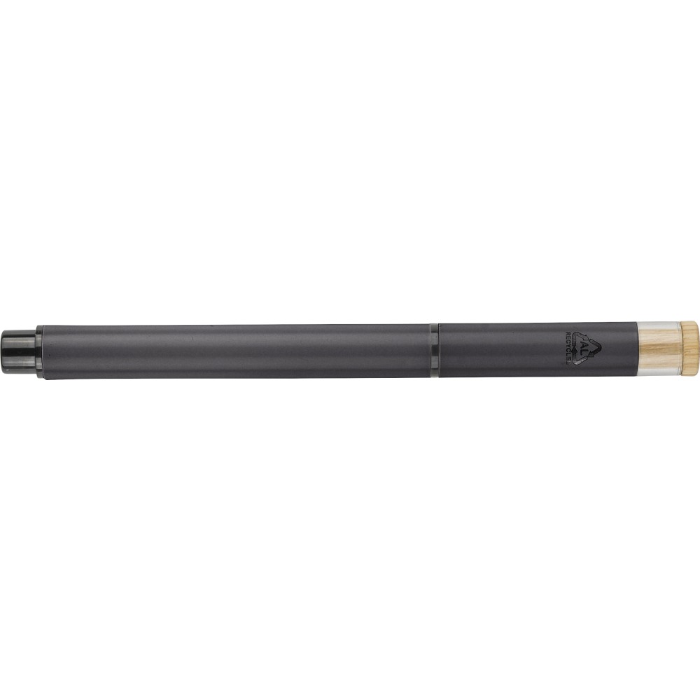 Recycled aluminium lacquered pen set with ballpen and roller pen. Features bamboo pusher, rPET trim, and metal clip; roller pen includes bamboo/rPET cap detail and matching clip. Both with engraved recycled logo. Writes approx. 700 m (ballpen) and 500 m (roller pen). Blue ink. Packed in colored recycled cardboard gift box.