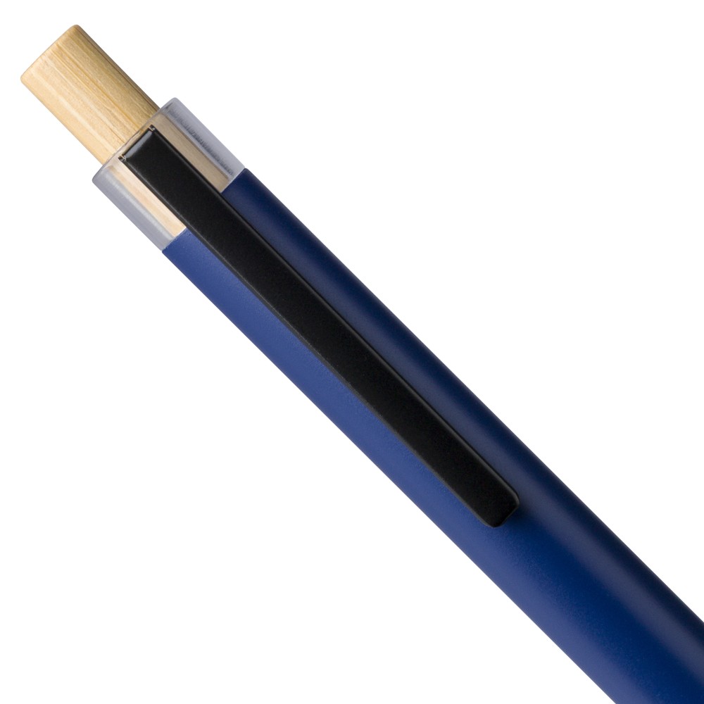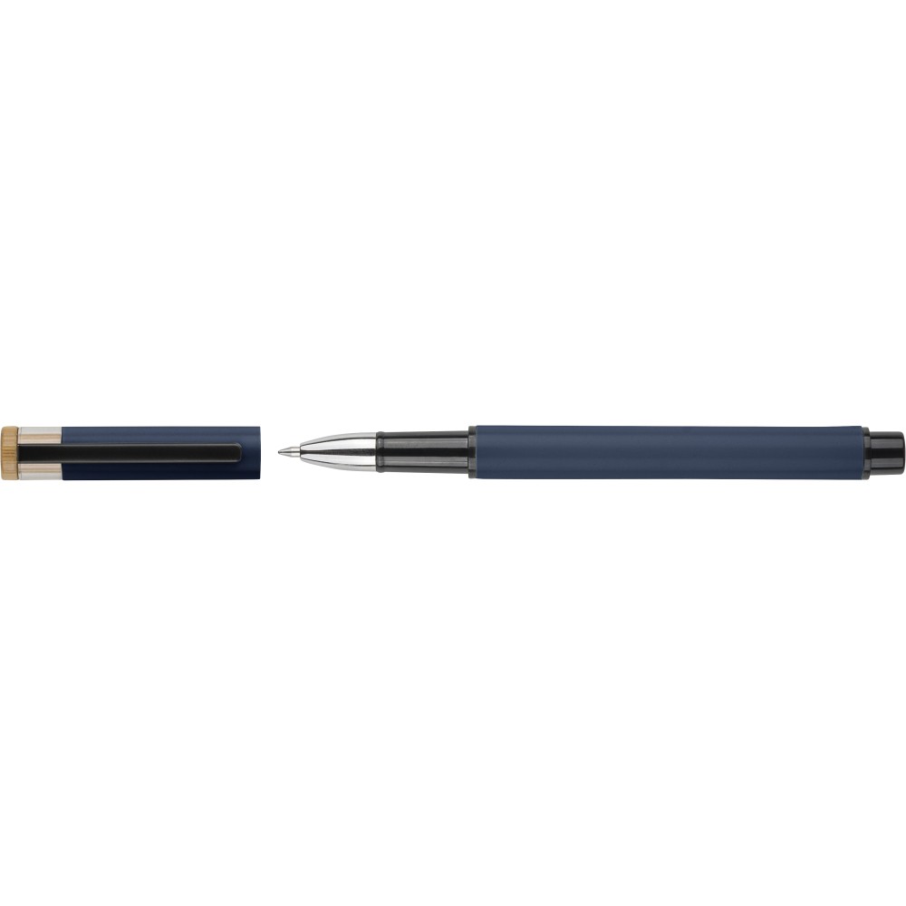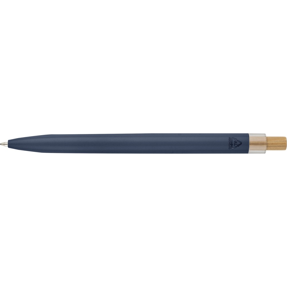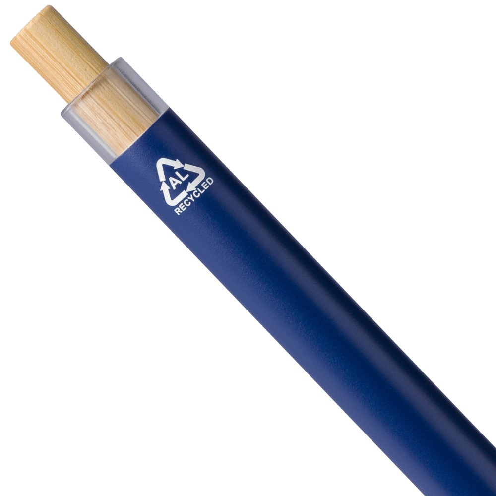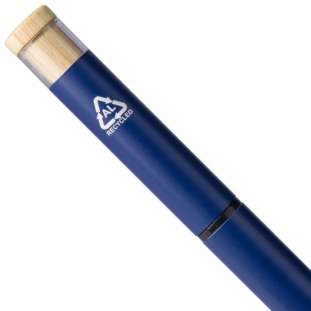 Recycled aluminium lacquered pen set with ballpen and roller pen. Features bamboo pusher, rPET trim, and metal clip; roller pen includes bamboo/rPET cap detail and matching clip. Both with engraved recycled logo. Writes approx. 700 m (ballpen) and 500 m (roller pen). Blue ink. Packed in colored recycled cardboard gift box.