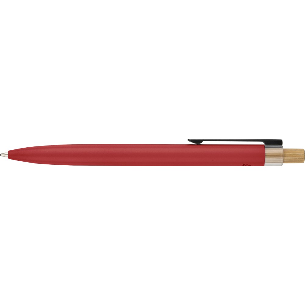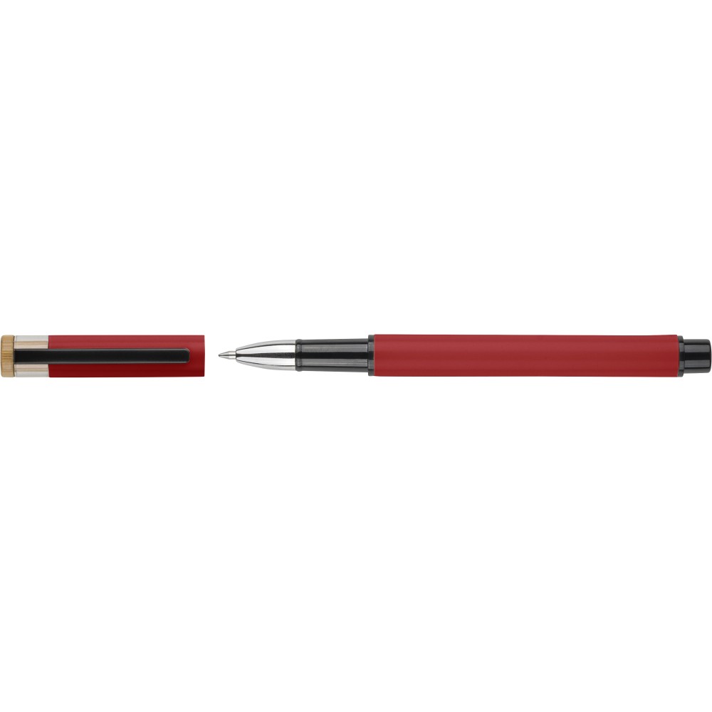 Recycled aluminium lacquered pen set with ballpen and roller pen. Features bamboo pusher, rPET trim, and metal clip; roller pen includes bamboo/rPET cap detail and matching clip. Both with engraved recycled logo. Writes approx. 700 m (ballpen) and 500 m (roller pen). Blue ink. Packed in colored recycled cardboard gift box.