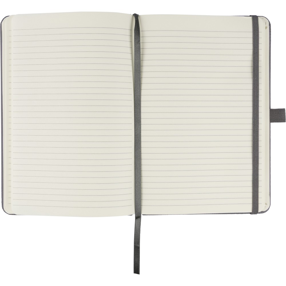 rPET 600D polyester notebook with PU coating, paper size A5. Contains 80 sheets of 70 gsm lined paper and features a ribbon bookmark, elastic band, and pen loop. Semi-hard cover design. Includes an embossed recycled logo on the backside.