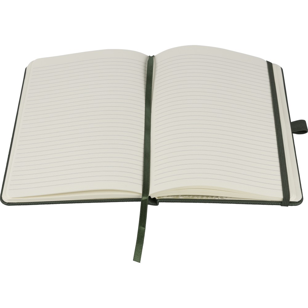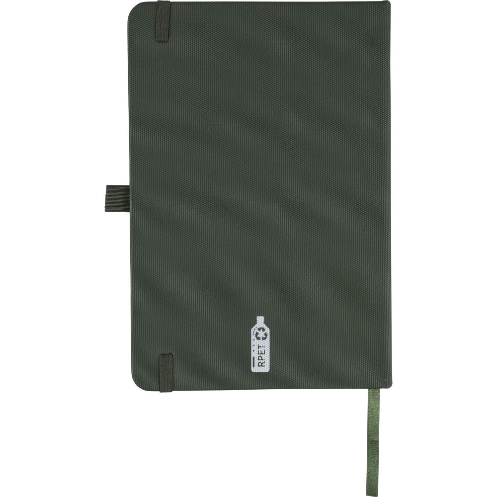 rPET 600D polyester notebook with PU coating, paper size A5. Contains 80 sheets of 70 gsm lined paper and features a ribbon bookmark, elastic band, and pen loop. Semi-hard cover design. Includes an embossed recycled logo on the backside.