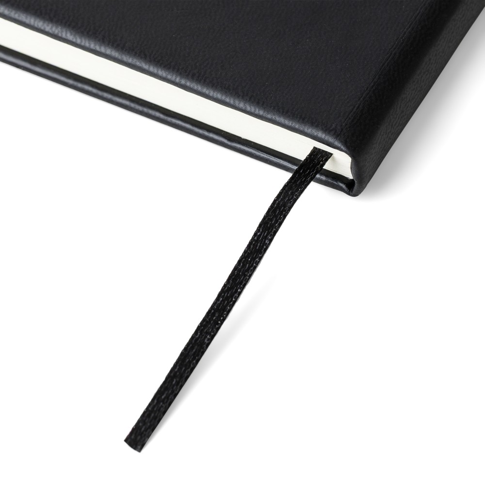 rPET polyester A5 notebook with partly laserable PU front. After engraving, the color matches the rPET fabric. Features 80 lined 70 gsm pages, elastic band, pen loop, and ribbon marker. Lower PU section is designed for engraving to reveal matching color.