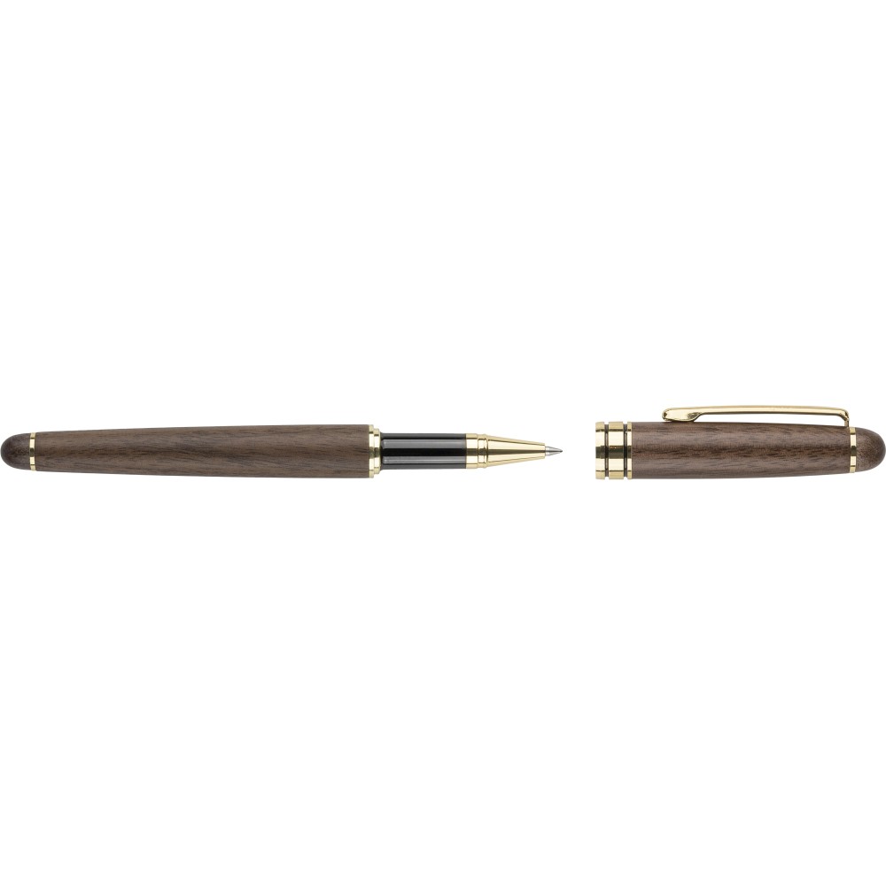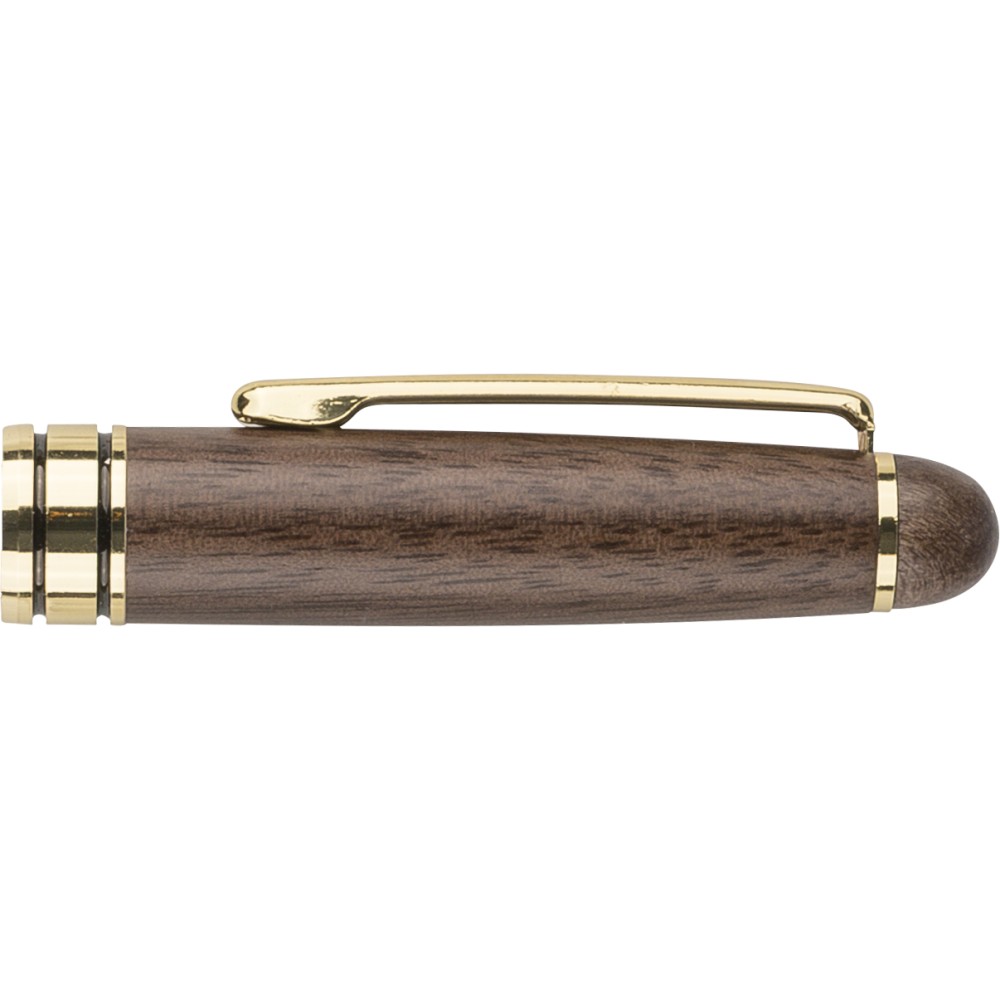 Walnut wood and brass pen set with twist ballpen (approx. 1,000 meters) and rollerball (up to 400 meters), both with blue German Dokumental ink. Ballpen features metal tip, clip, and trim. Packaged in maple wooden box and brown cardboard box.
