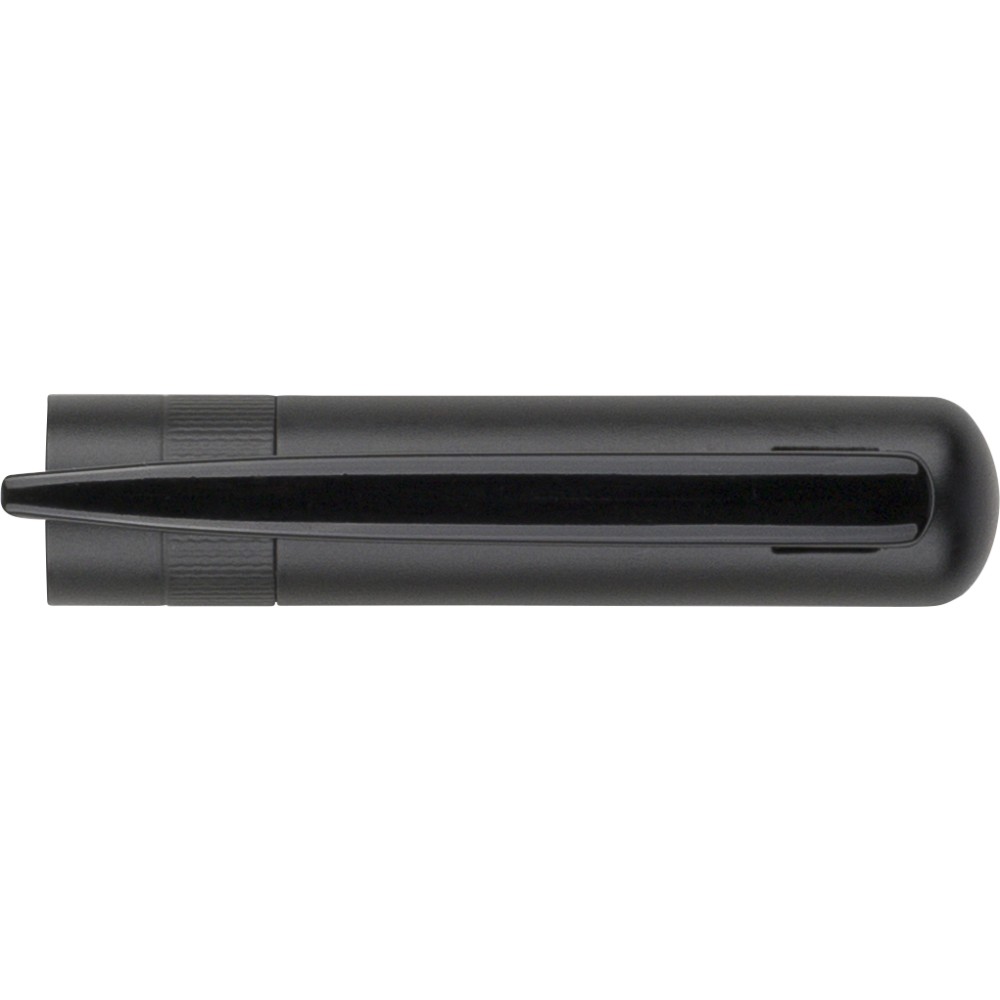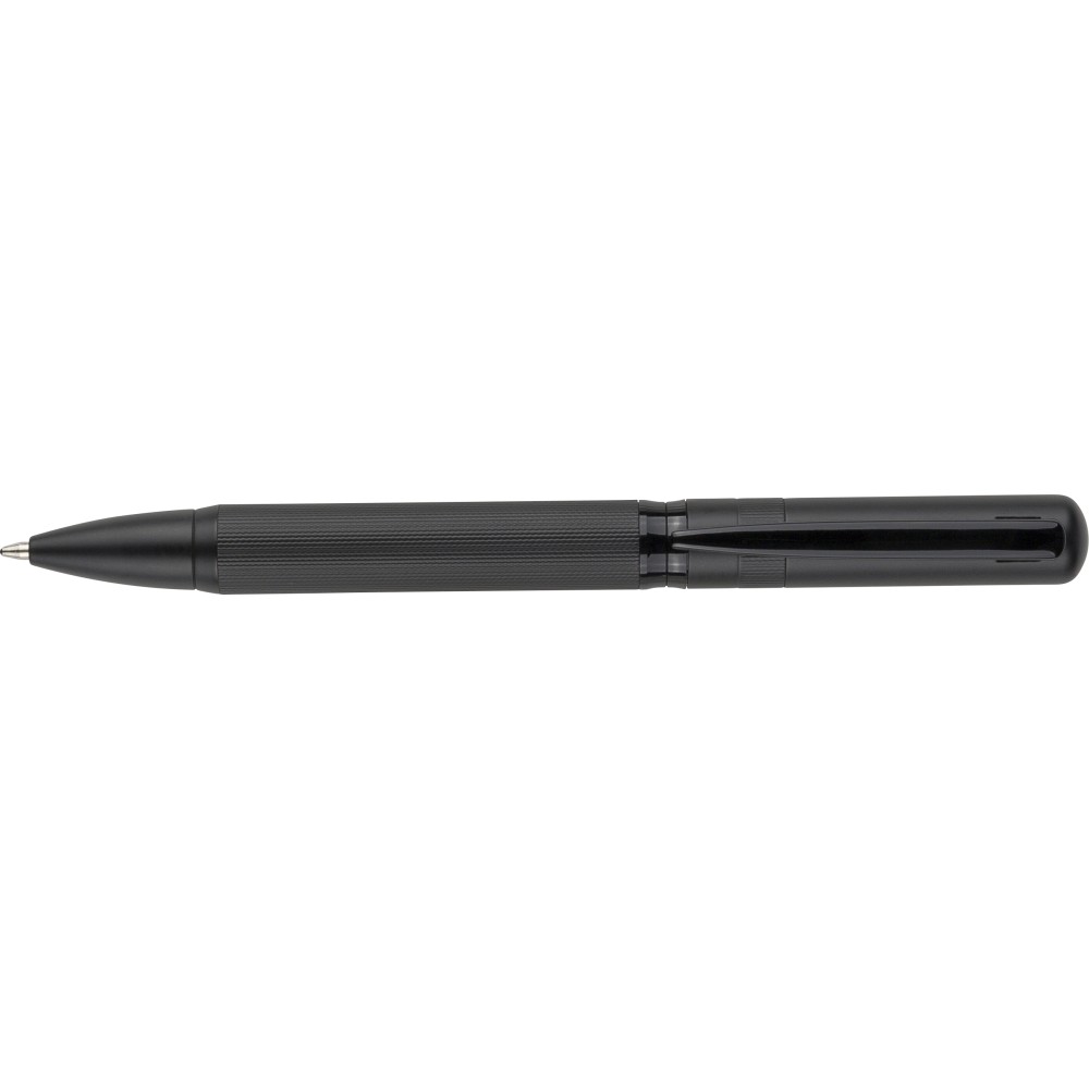 Metal and ecobrass pen set with twist ballpen (writes approx. 1,000 meters) and rollerball (writes approx. 400 meters), both with blue German Dokumental ink. Packaged together in a black sliding box.